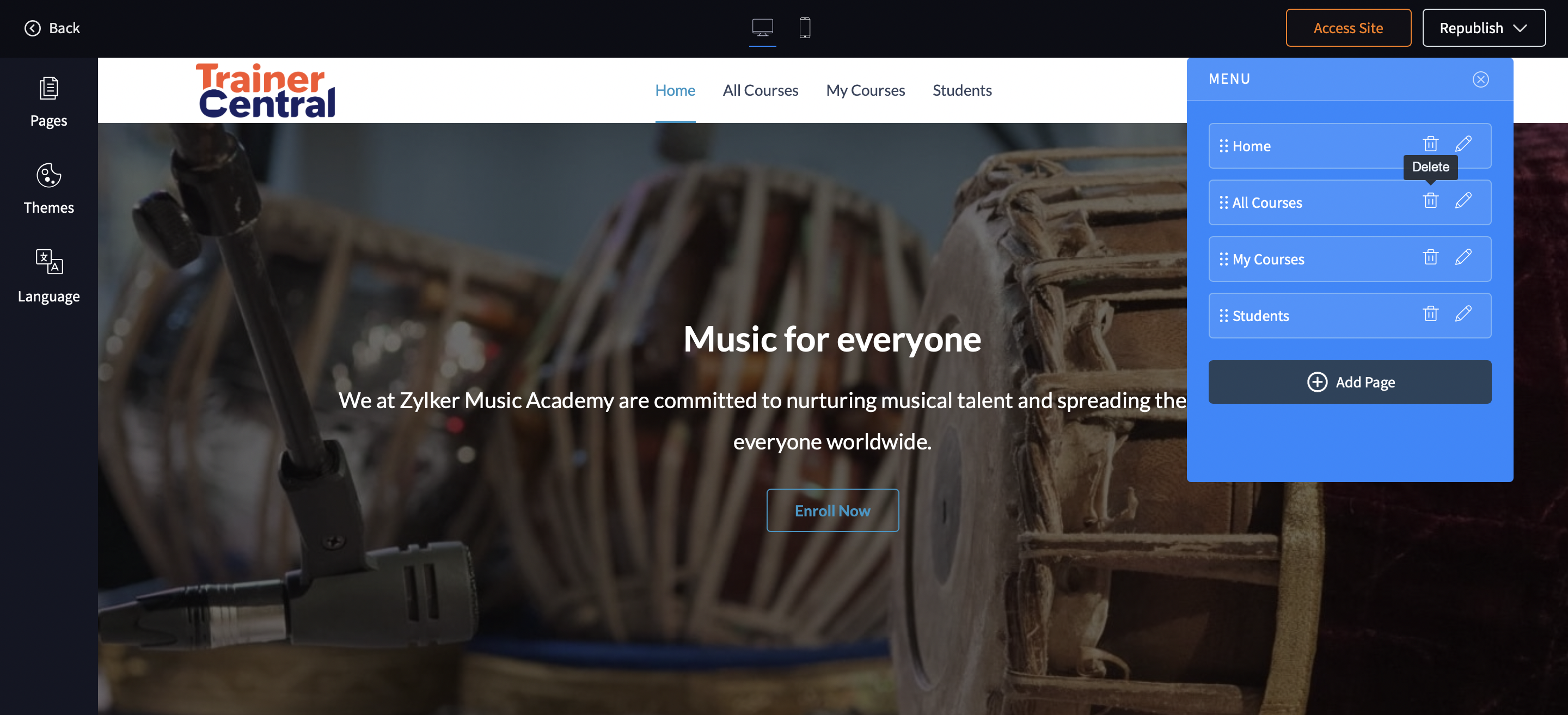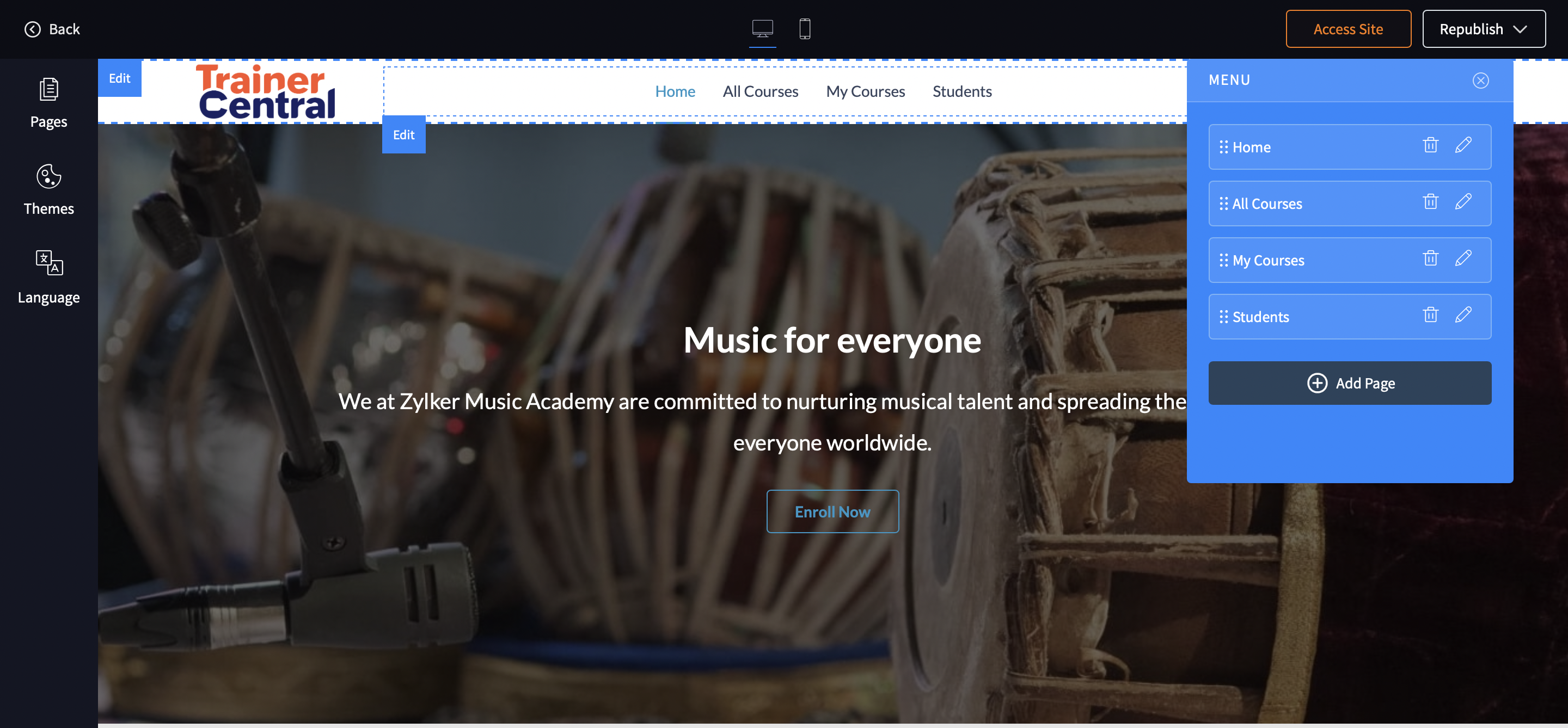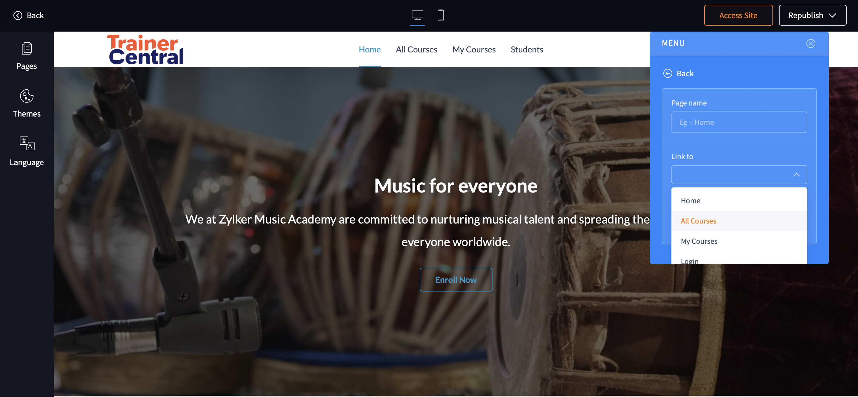 TrainerCentral allows you add custom pages to your site that you can completely design, configure, and publish based on your branding and style preferences. This help article is for old site editor and only applicable to academies created before ...
