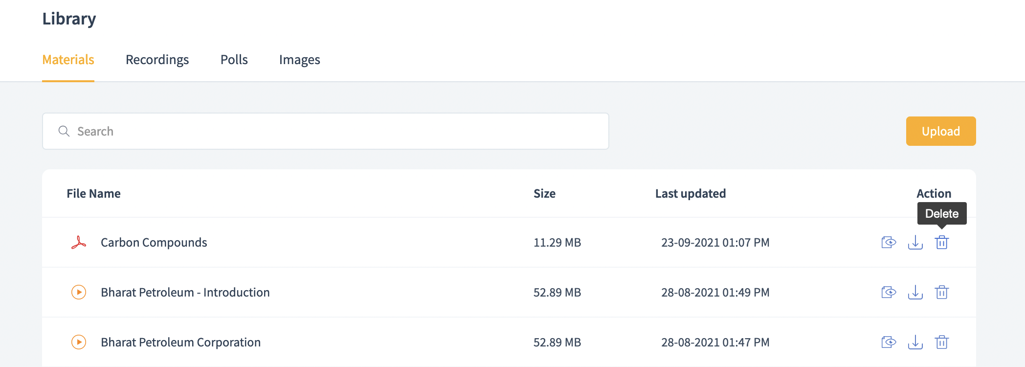 Navigate to the Library menu from the left pane and click on Delete button available right next to the name of the material listed under the Materials tab.