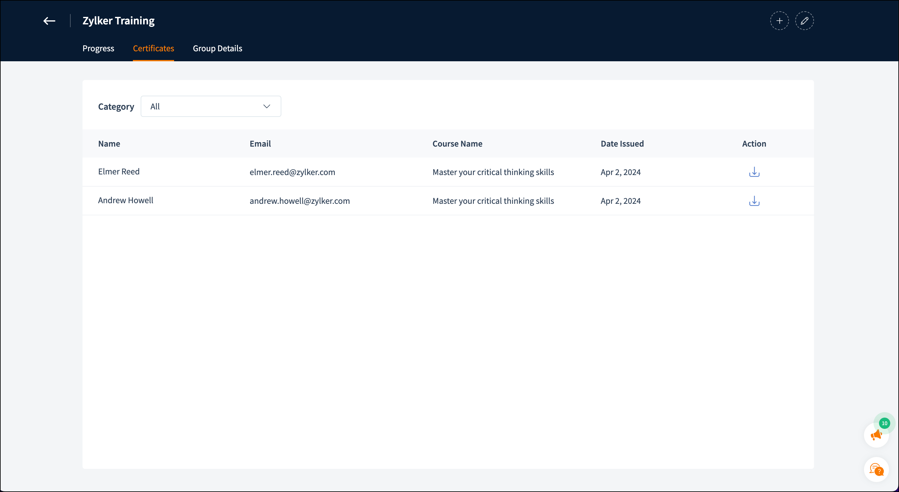 Click the Download icon under the Action column for the required learner. The learner's certificate will be downloaded.
