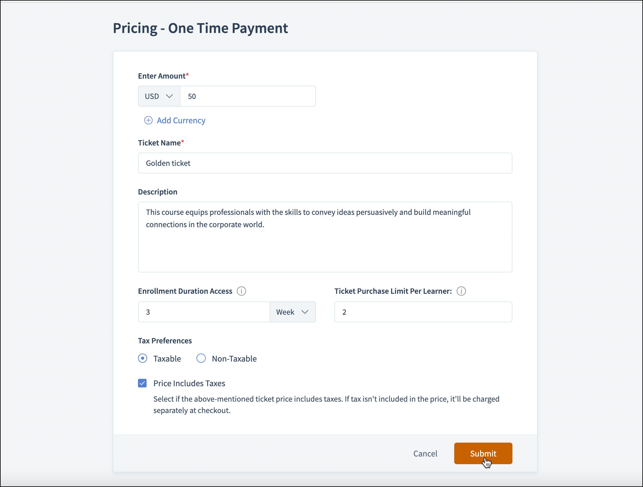 For any ticket configured, you can choose to display the ticket in a particular currency to all users across the globe or display the course price in different currencies when accessed from different countries. This way any prospect accessing the ...