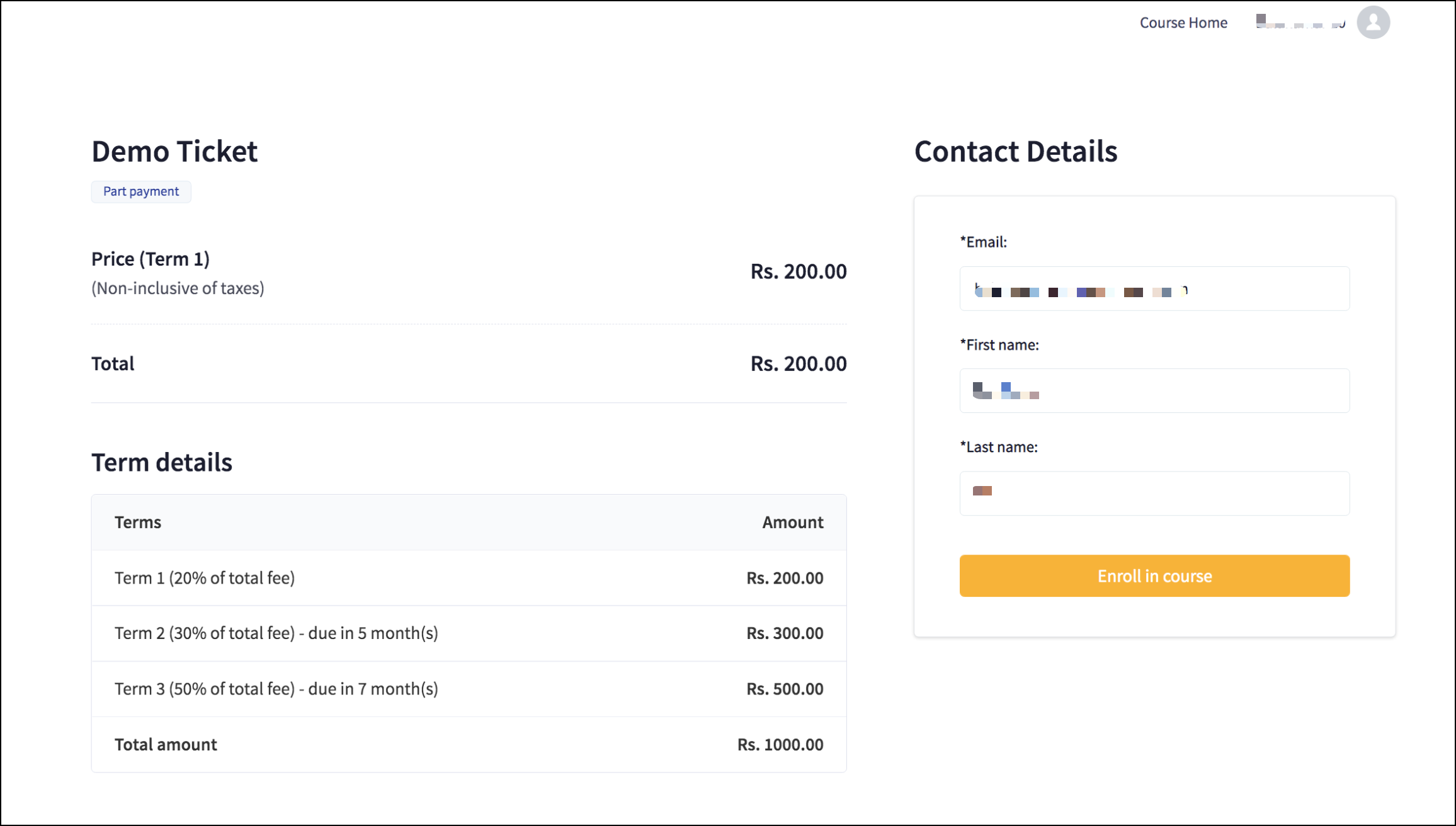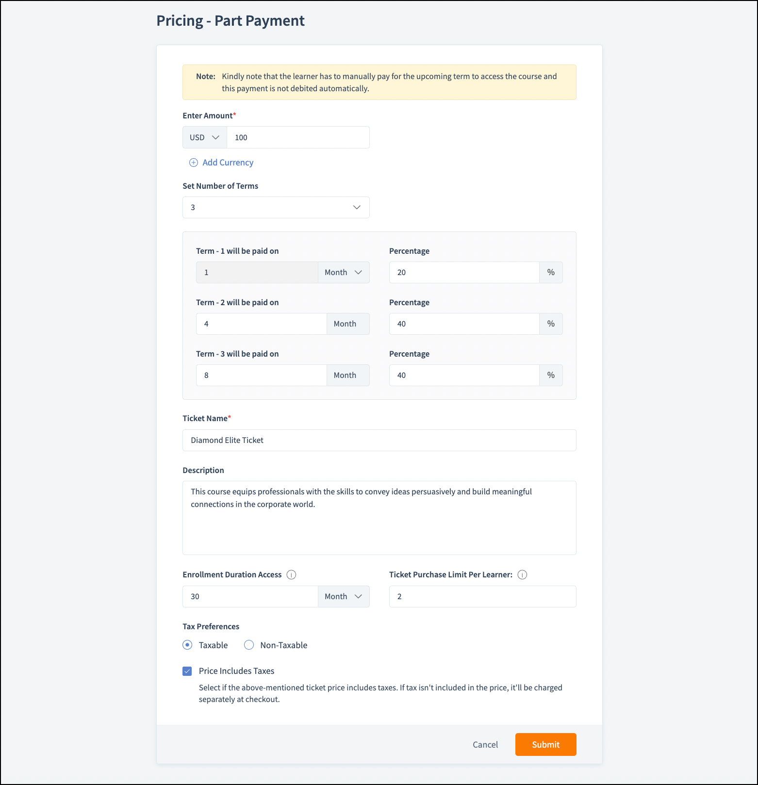 For example, consider a course called Communication Skills, which is offered for $100. You can configure the percentage that you wish to collect in the three monthly terms. For instance, you may mention 20% in the first month term, 50% in the second month term, and 30% in the third month term. Now, your learners have to pay $20 during the first month, $50 in the second month, and $30 in the third month.