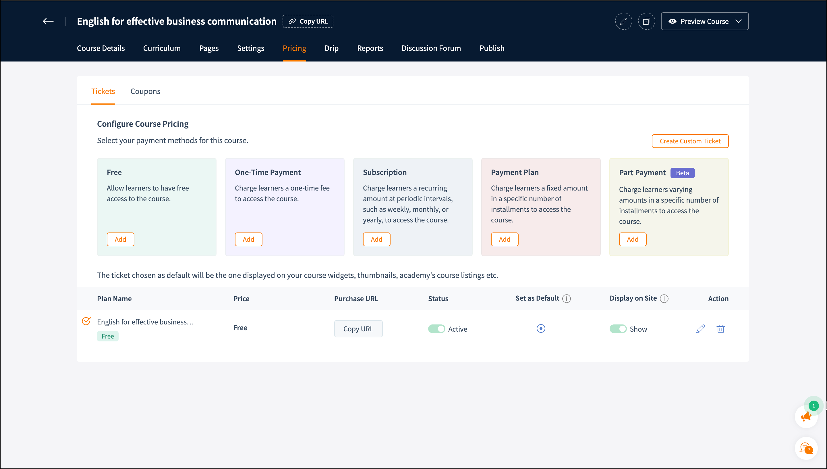 - Click the created course thumbnail icon. A new window with the set of Course manage options will appear. From here, access the Pricing tab.The pricing window will display with the tickets option available in TrainerCentral. Each course will be configured to a free ticket as the default setting. You can add multiple pricing tickets for your course. If the course is published without setting up any tickets, the default free ticket will be displayed to your website visitors and learners. To learn more about the features of each ticket, please refer to this help article.