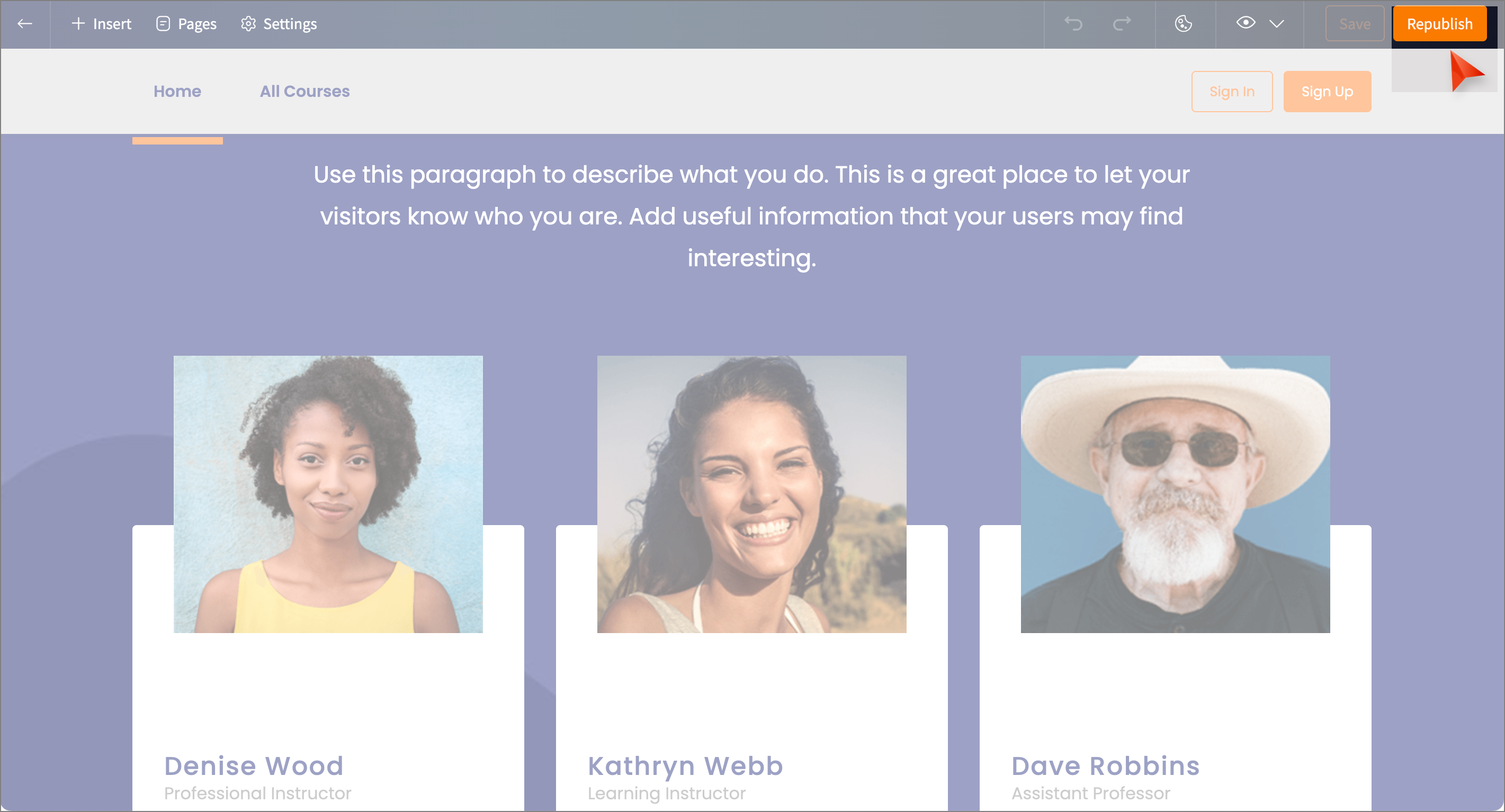 A website is made of several pages that can showcase your offerings in detail and drive leads and sales. TrainerCentral's website templates include three default pages: Home Page, All Courses, and All Sessions. You can also add additional webpages to ...