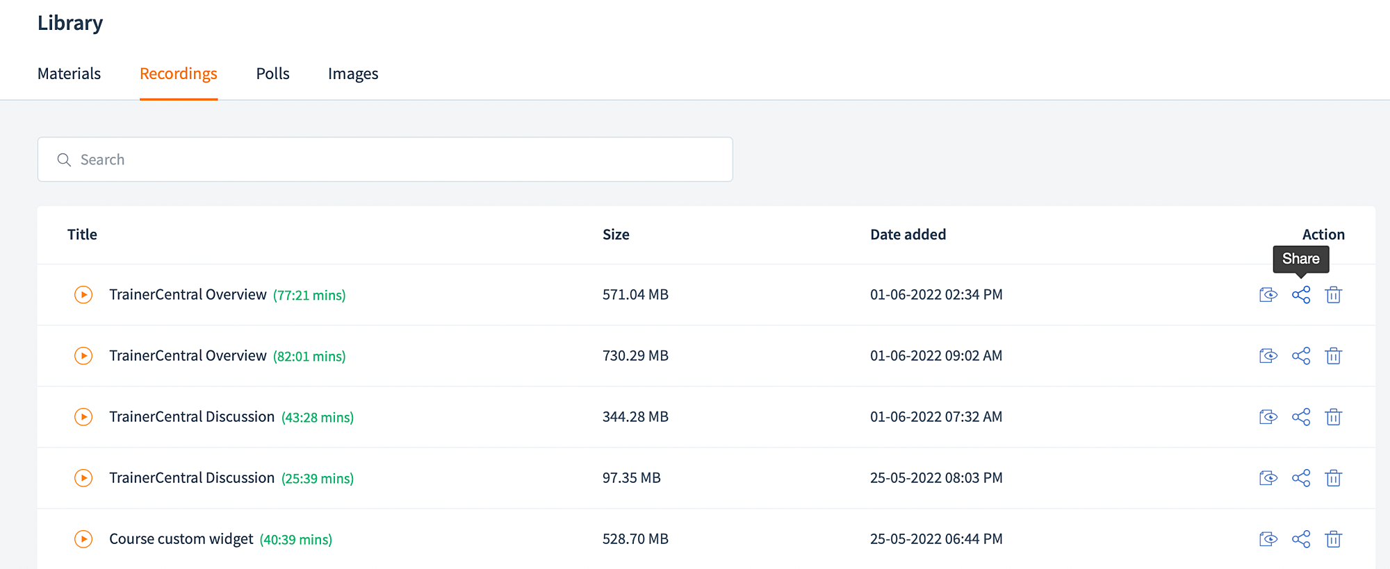 You can share all workshop recordings with your audience by clicking the Share icon under the Actionscolumn found in the Recordings tab.