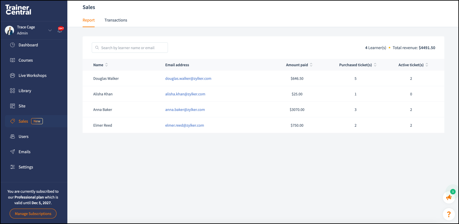 In Report, you can view all your learners' purchase details. You can get insights on total revenue, purchased tickets, and active tickets.