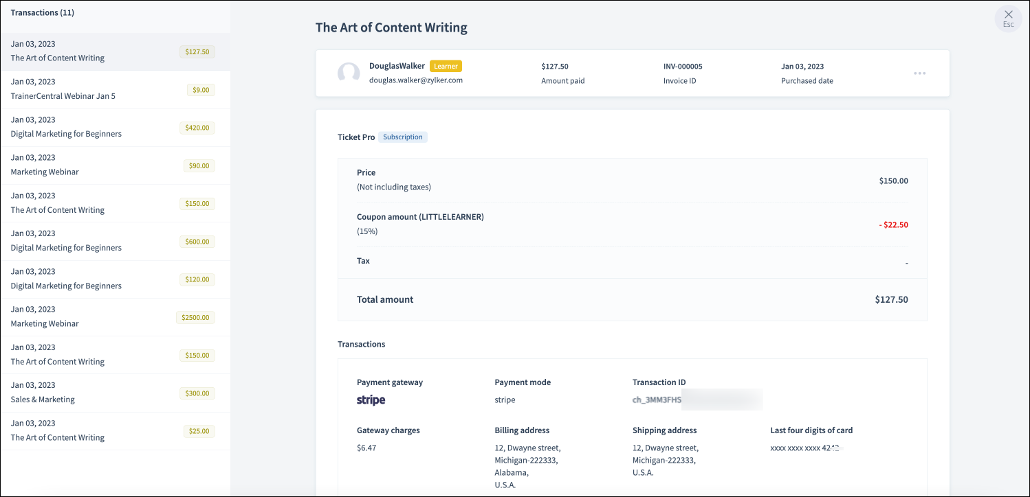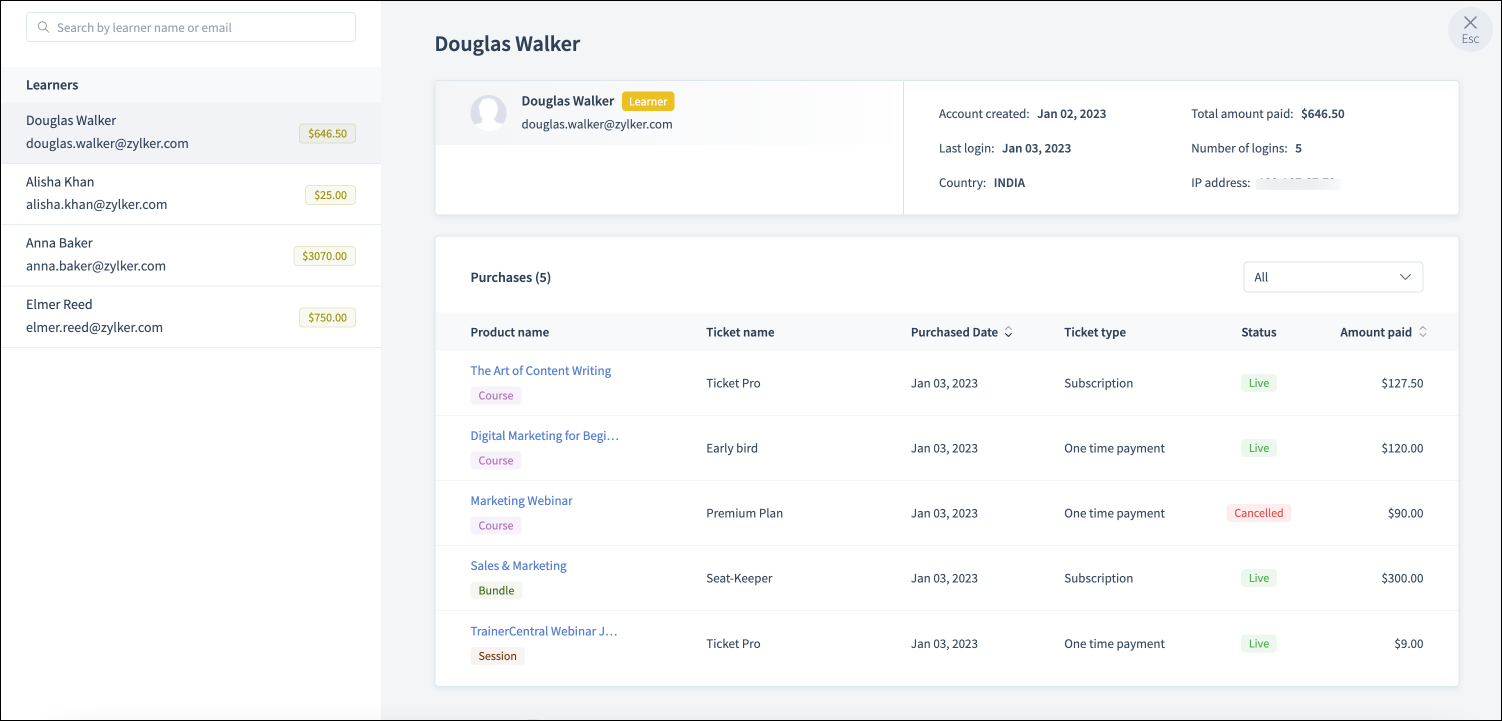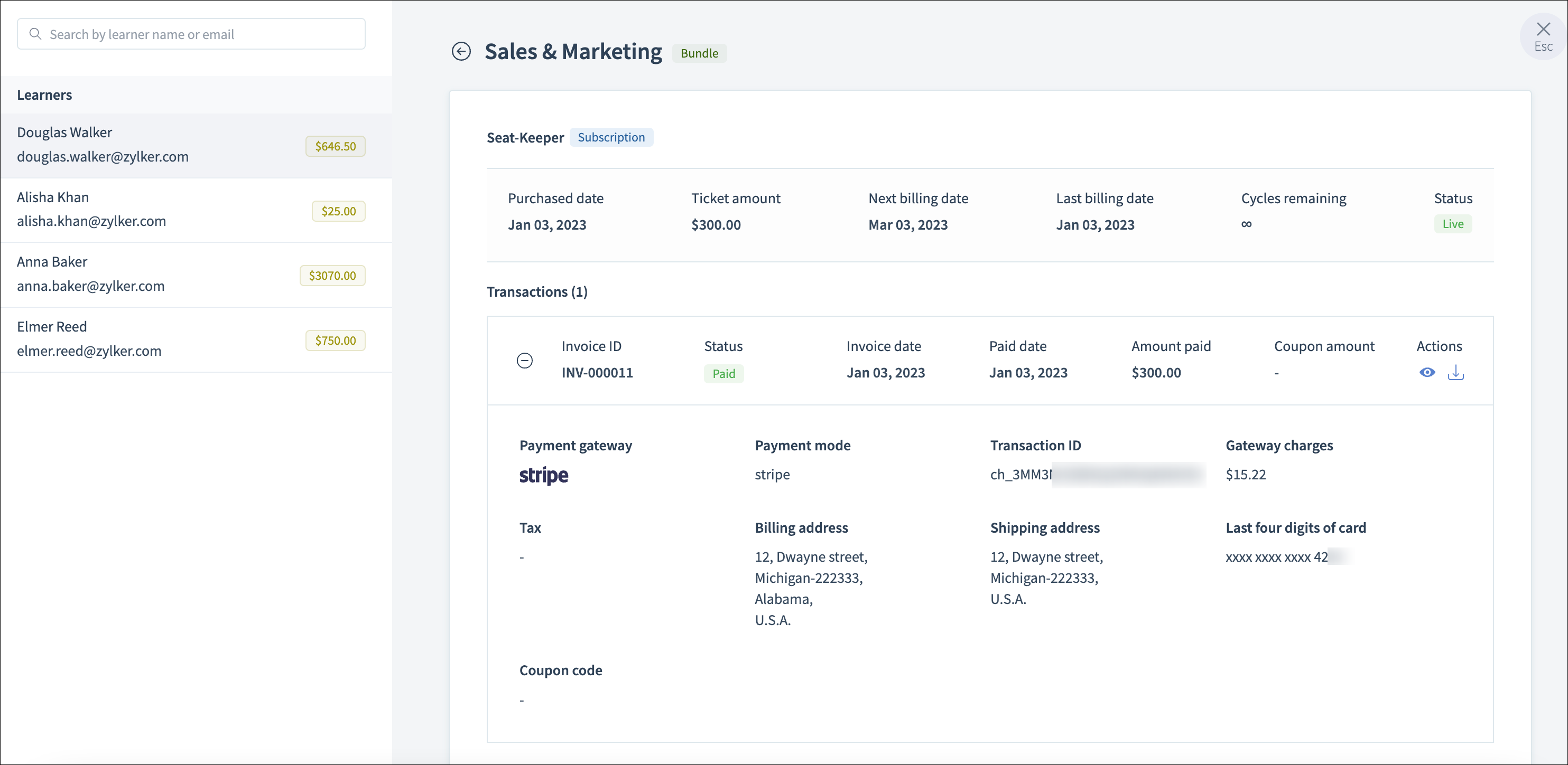 In the first section, you can view the selected learner's name, email address, amount paid, Invoice ID, Purchased date, and more menu.