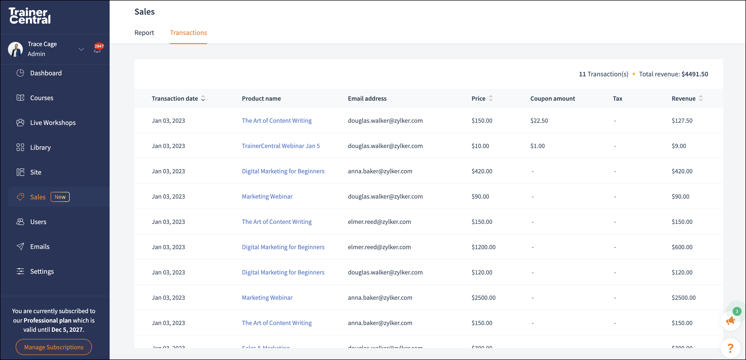 In TrainerCentral, you can track the revenue of your academy from the Sales tab. You can view the learner's purchase details and their overall contribution to the organization's revenue. You can track transactions based on a date, and even check the coupon amount and tax applied for each transaction.