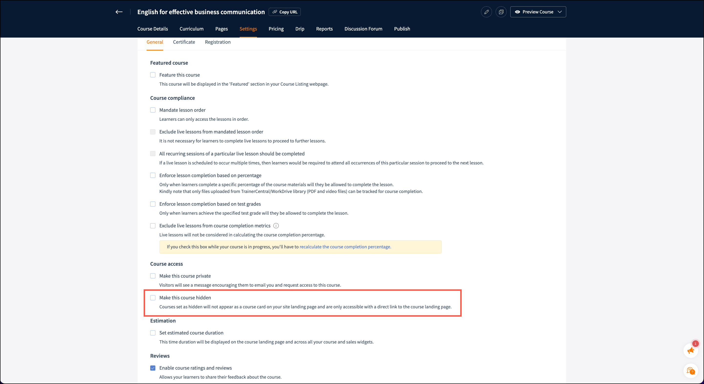 Hidden courses are the best way to control your course's information and content by enabling you to share the course with a specific audience.