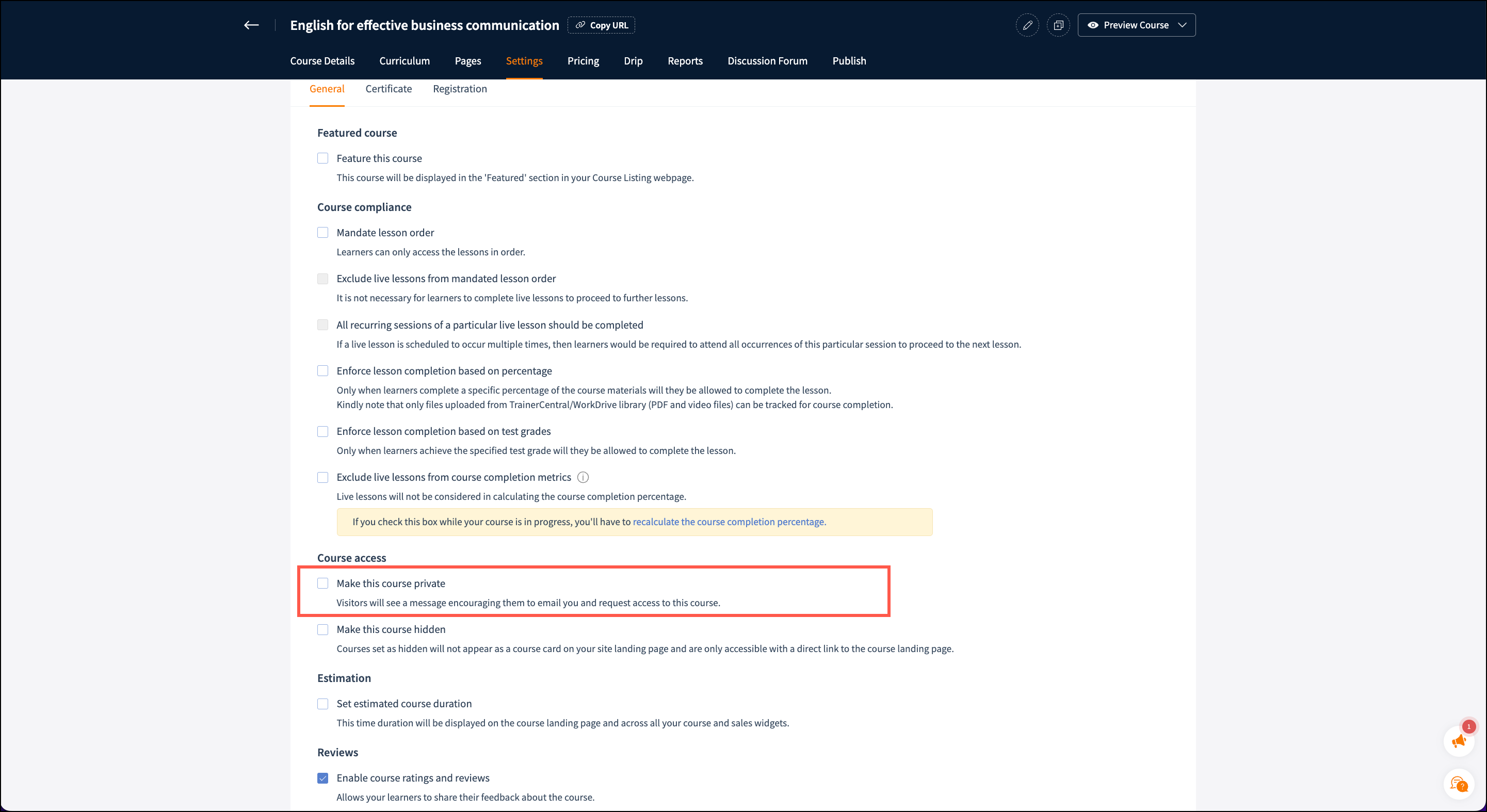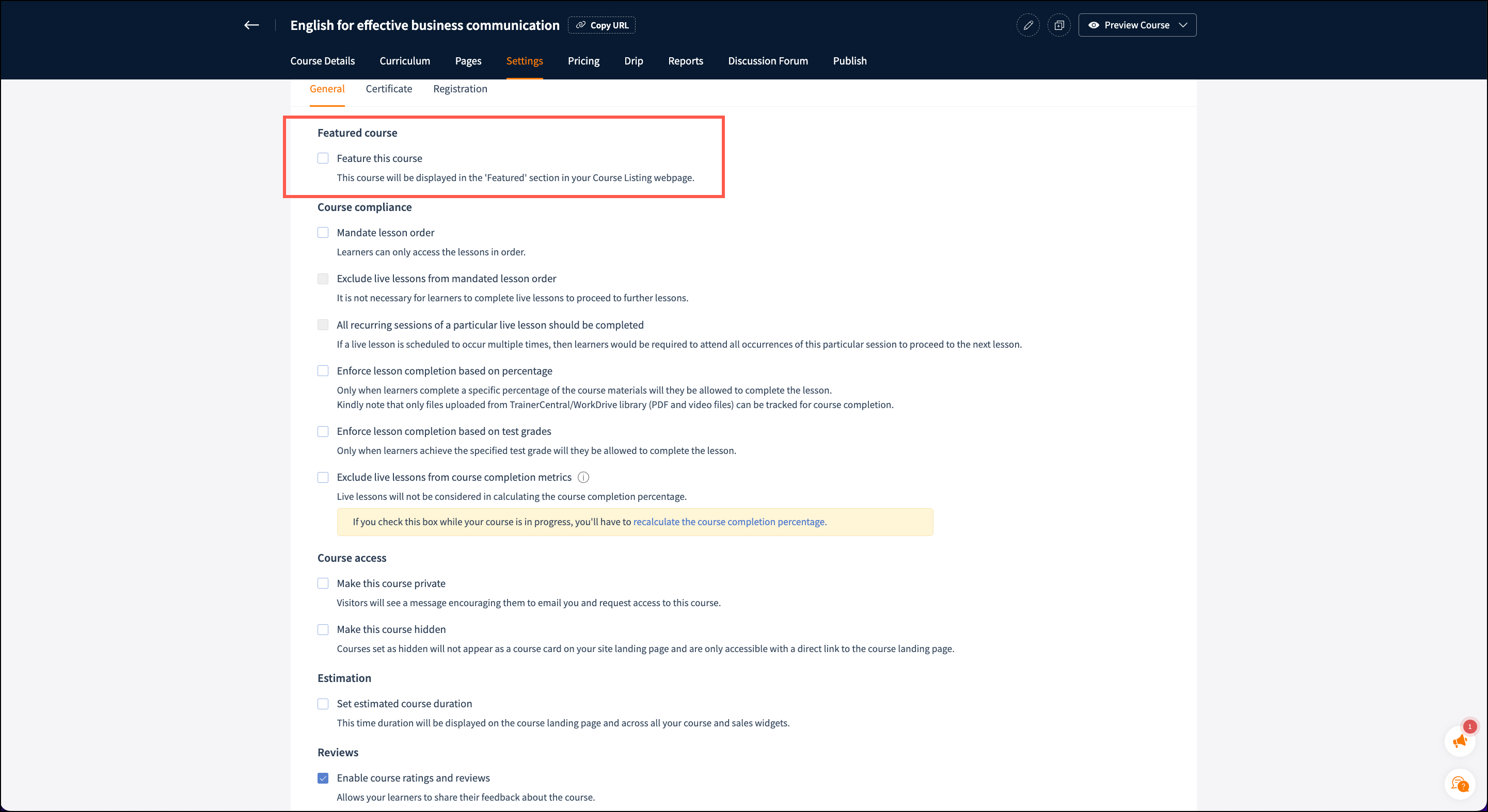 This help article will show you how to adjust settings to customize your courses to make them featured, private, or hidden and more.