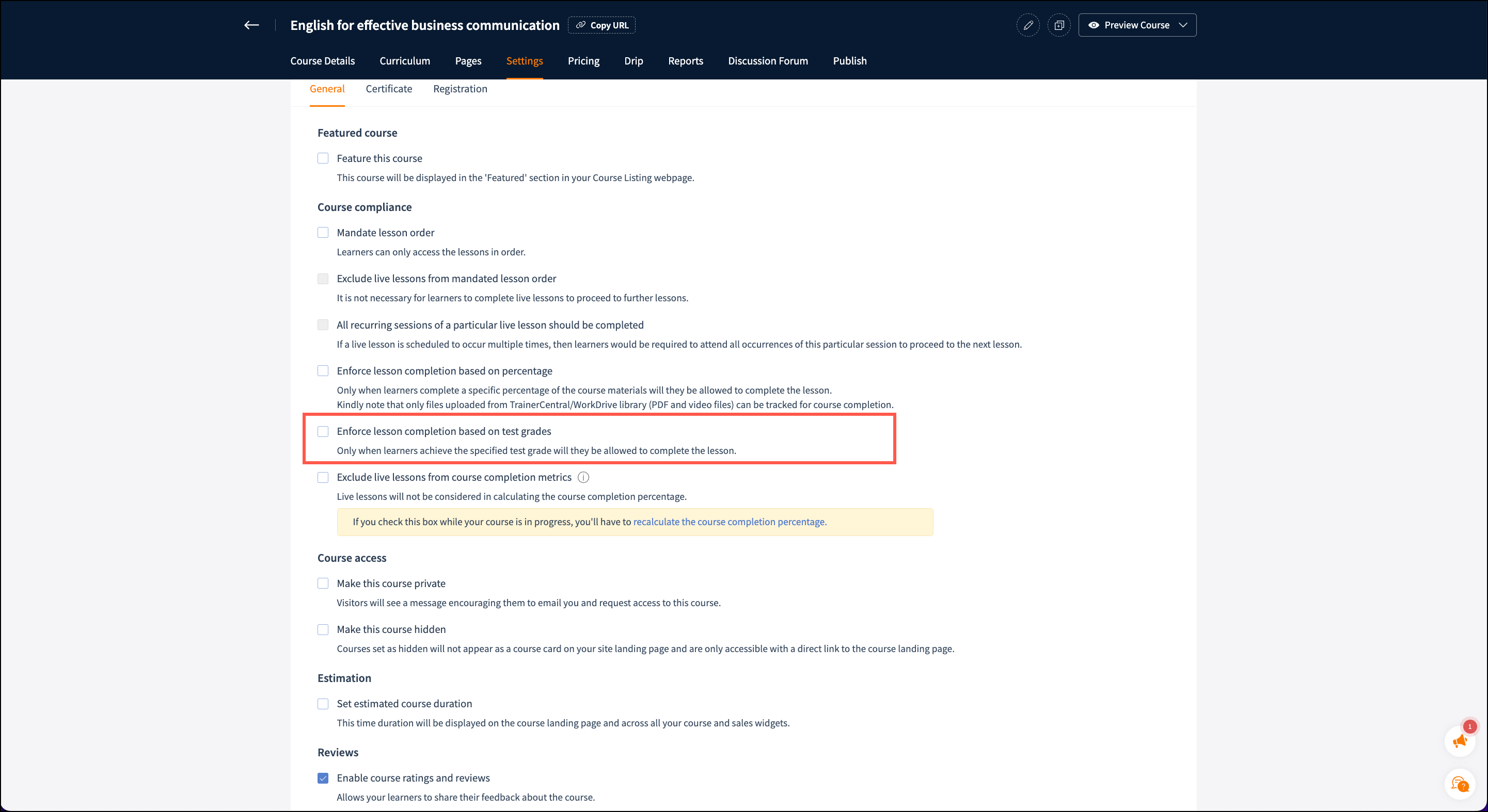 You can enable this checkbox to enforce lesson completion based on a learner's test grades. Only when a learner aces the test with the specified minimum grade will they be allowed to proceed to subsequent lessons.