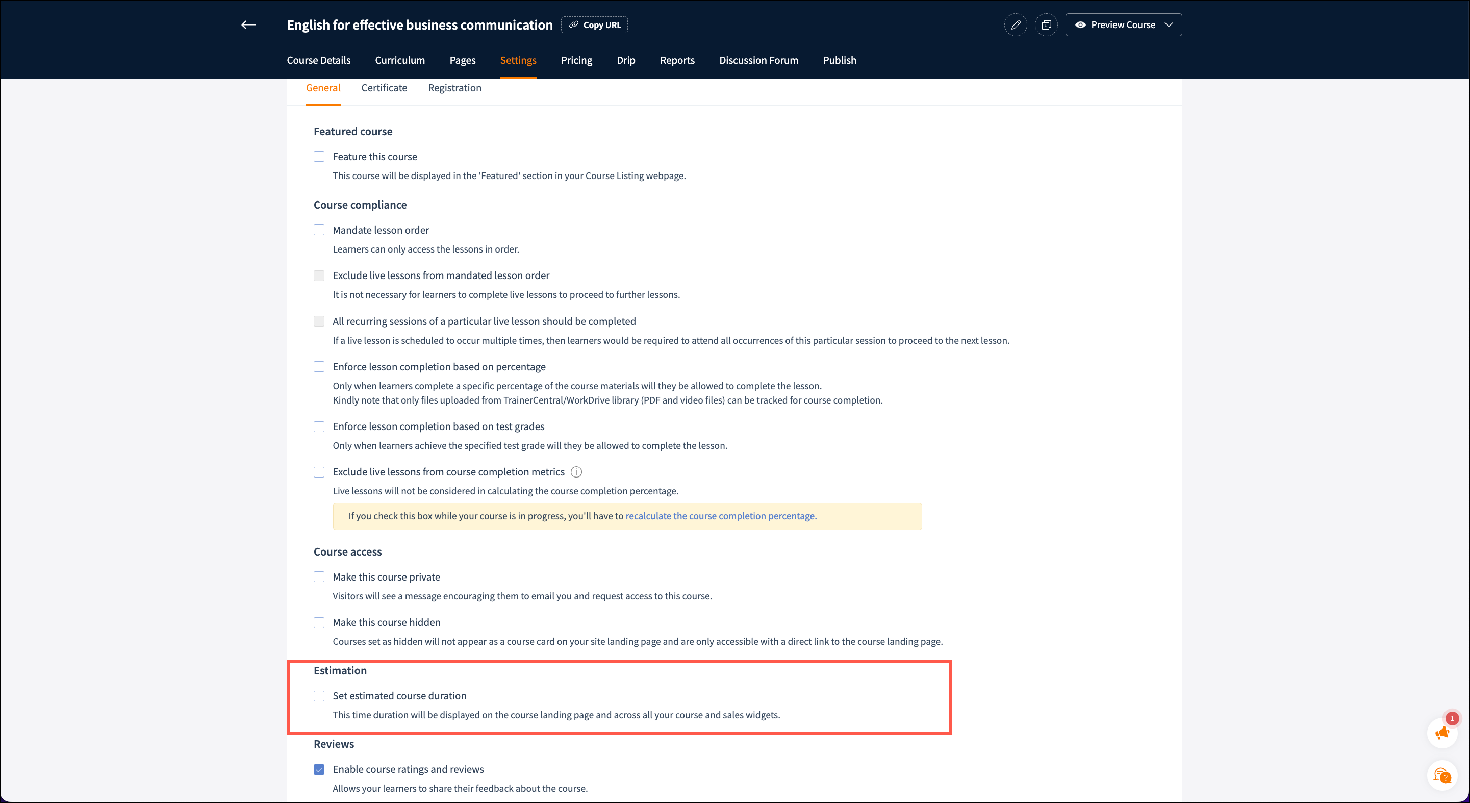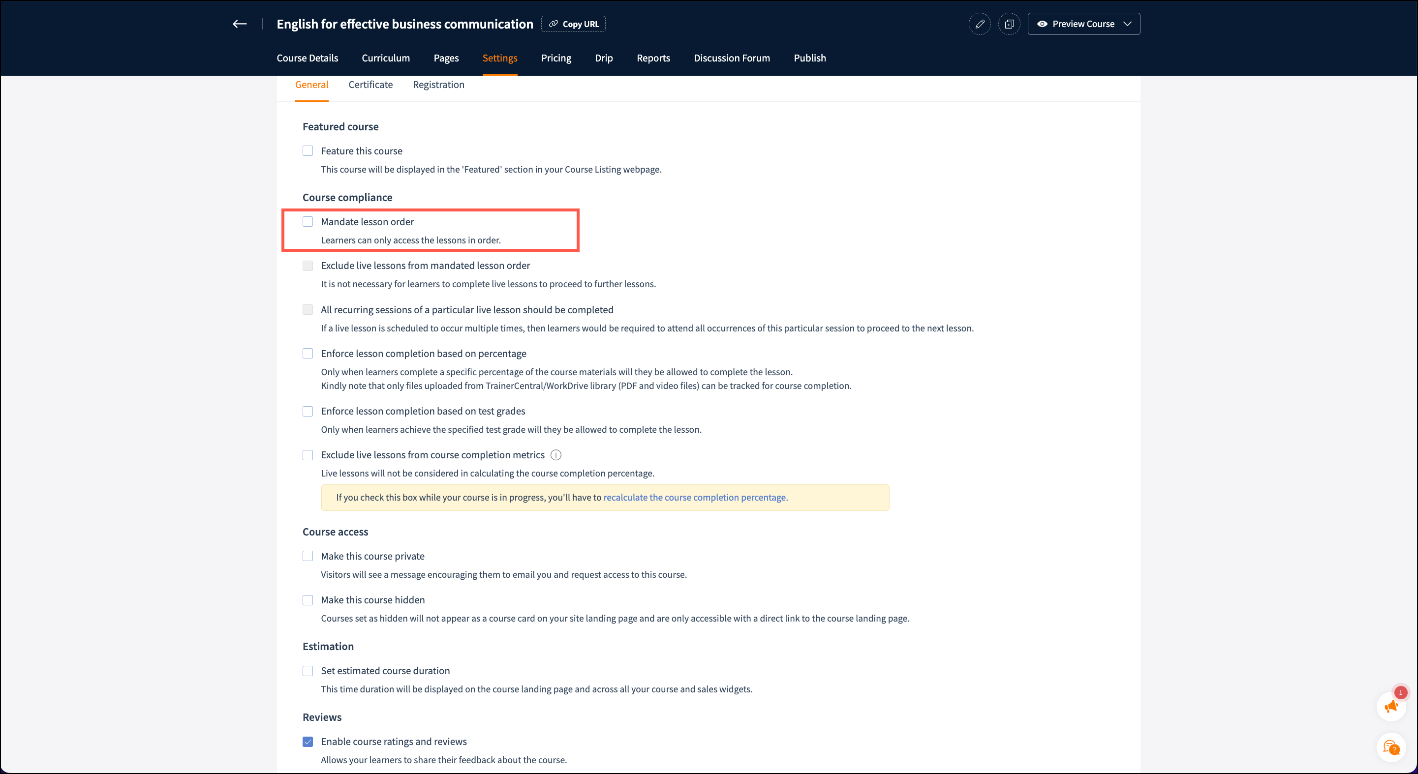 1. Click on the course for which you wish to mandate lesson order and navigate to the Settings tab.