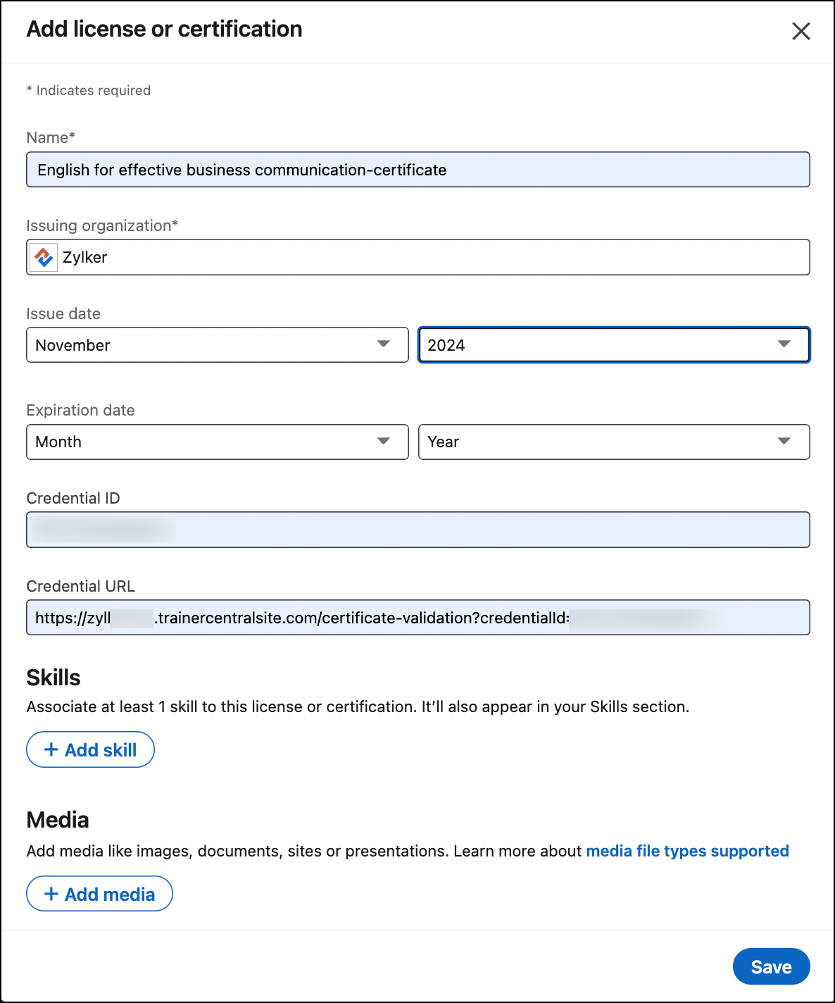 - Click Save. The certificate or badge will be added to your LinkedIn profile.