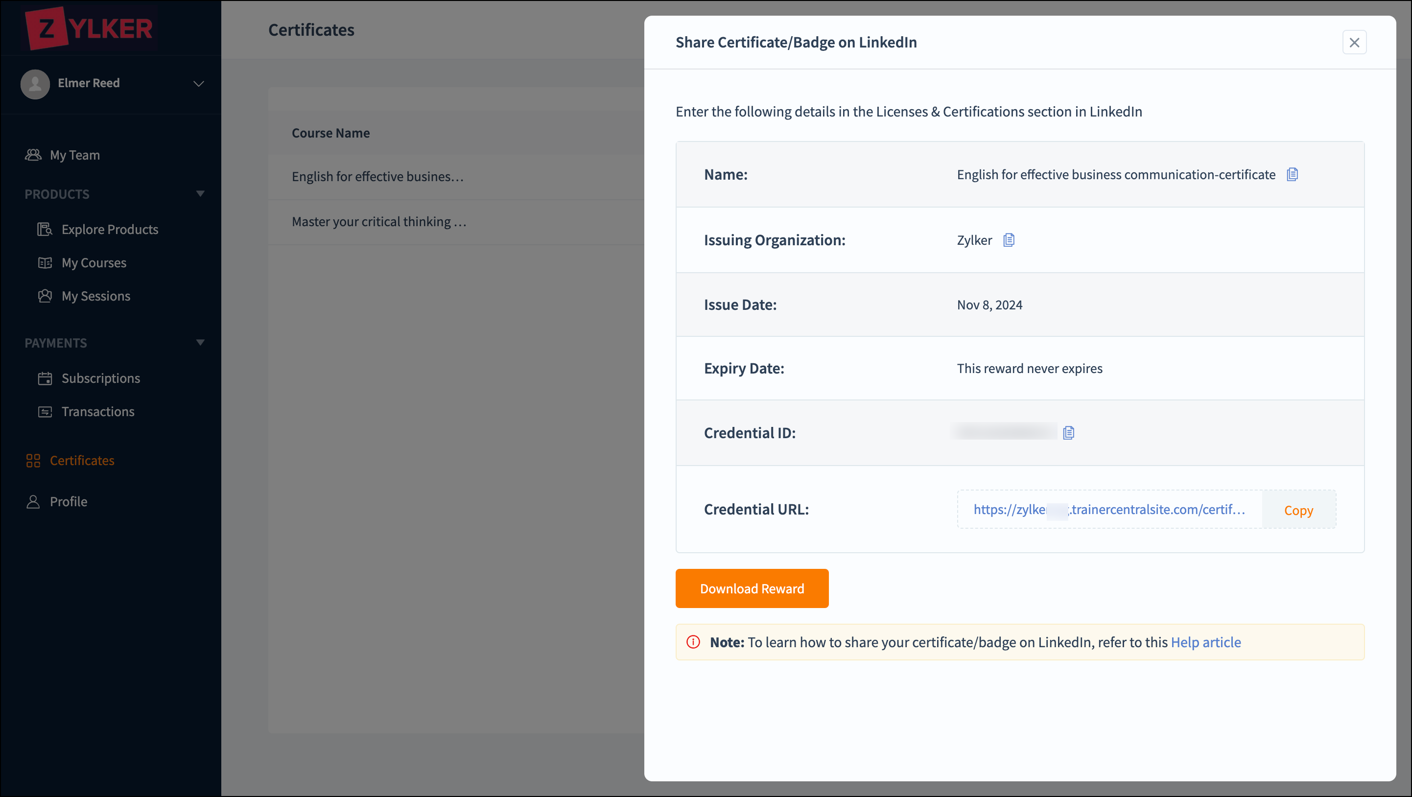 - Click the share icon of the course or session to share the certificate and badge on the LinkedIn platform. The Share Certificate/Badge on LinkedIn window will be displayed with the following certificate details: