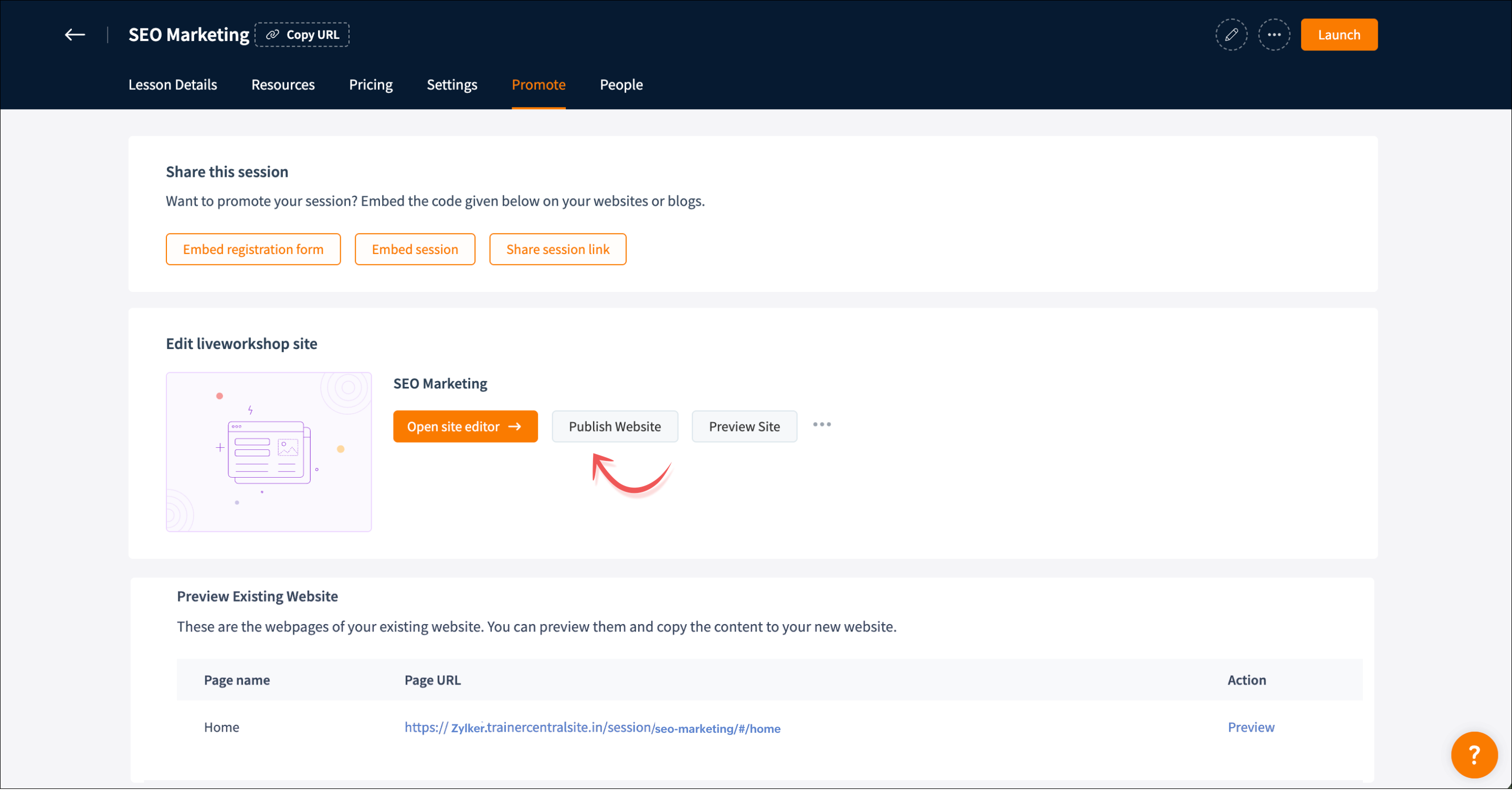 In the Preview Existing Website section, click Preview. The existing session webpage will be displayed in the same tab.