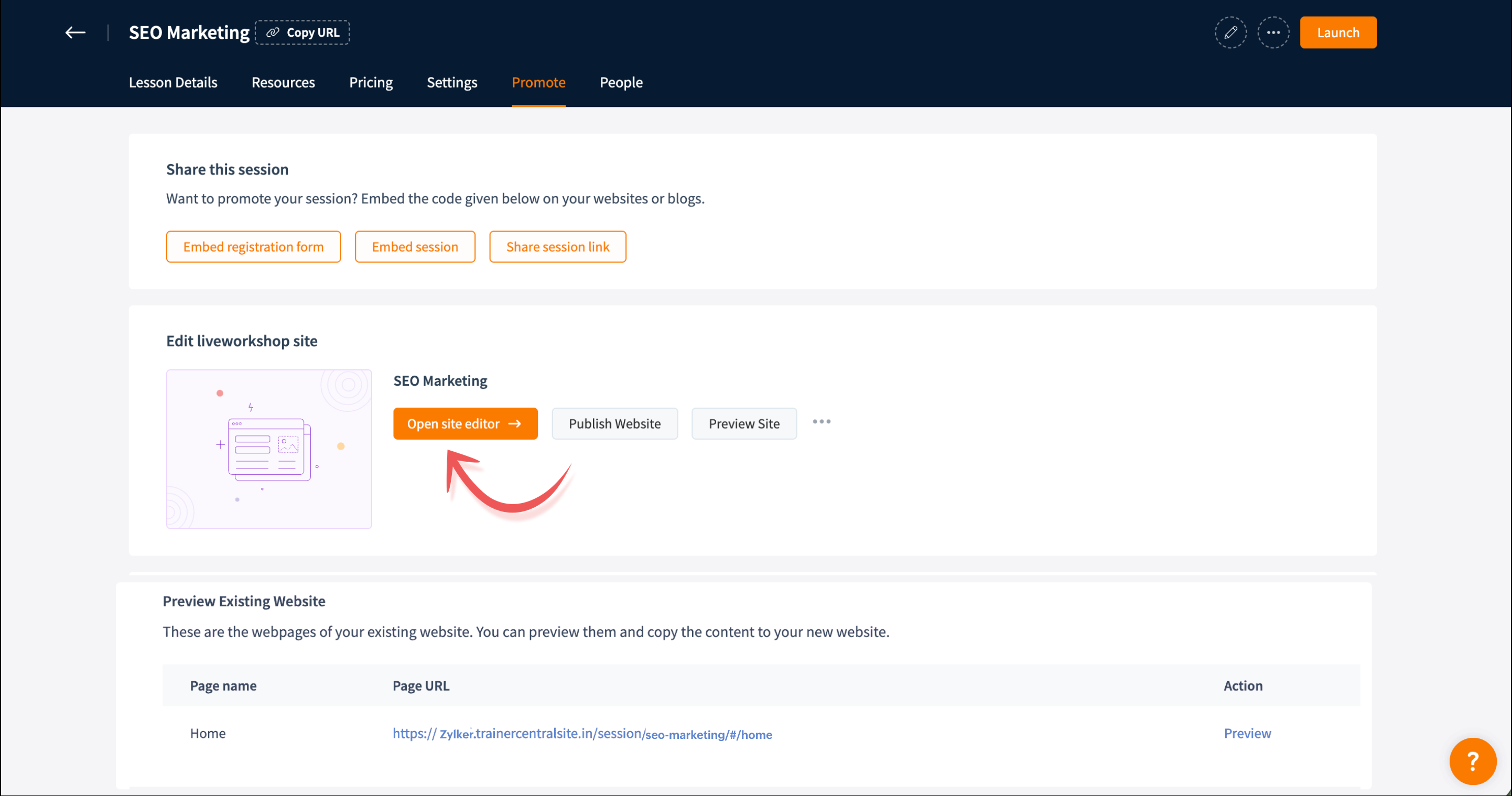 In the Edit liveworkshop site section, click Open site editor. The new session webpage will be displayed in a new tab.