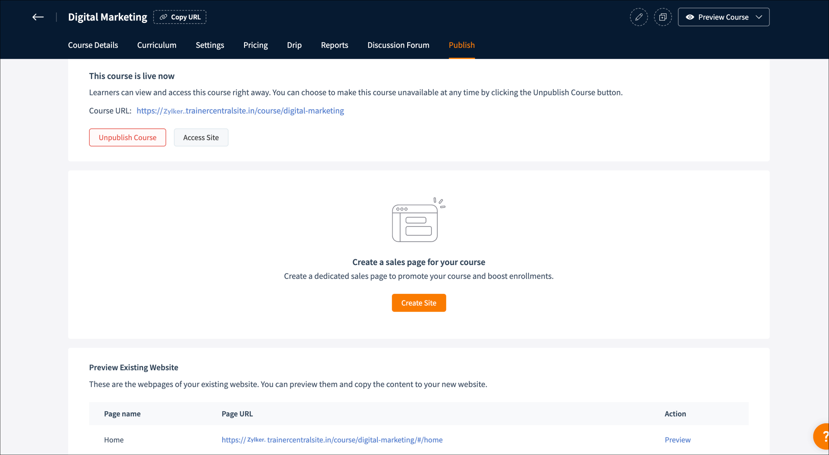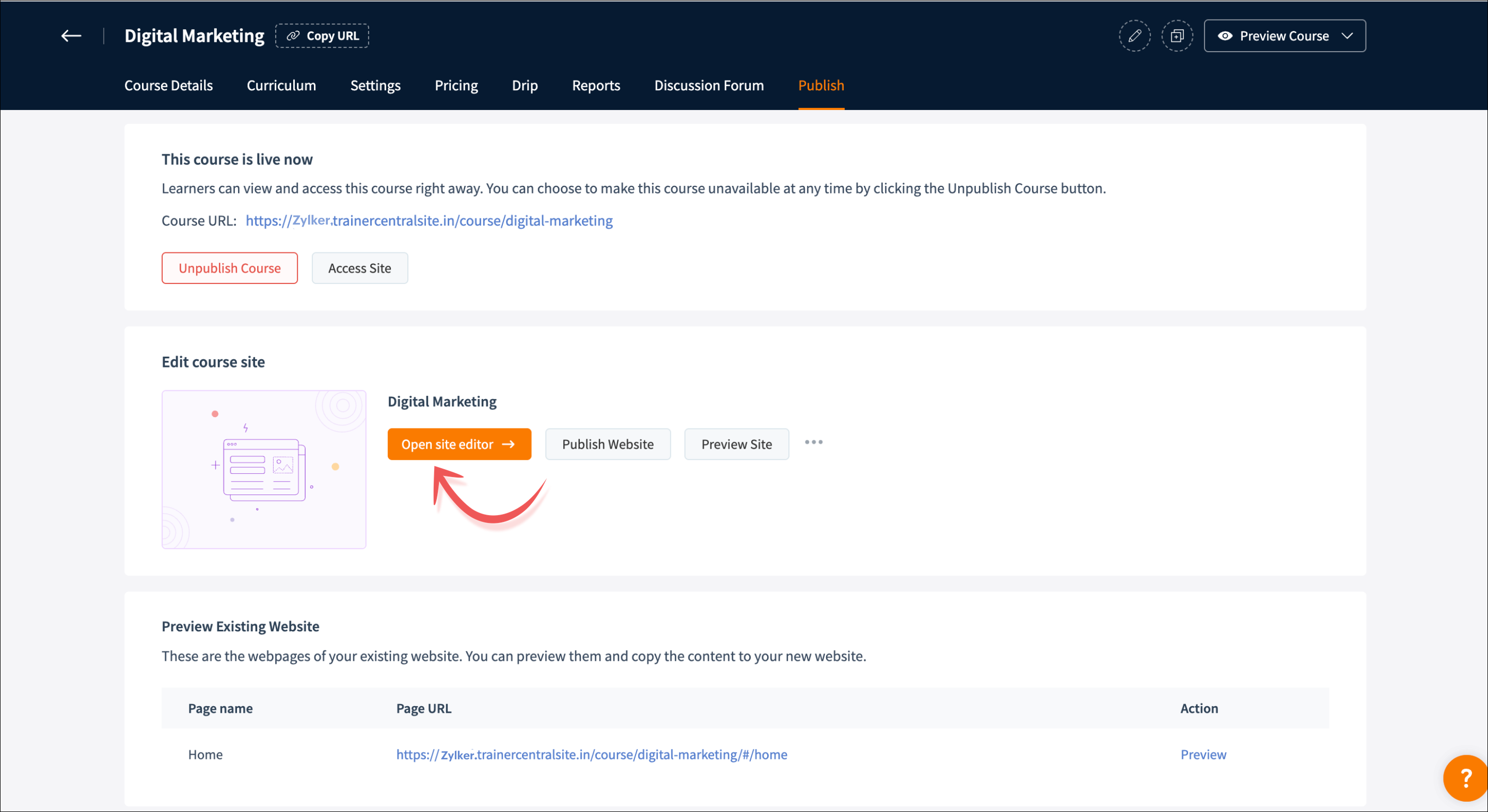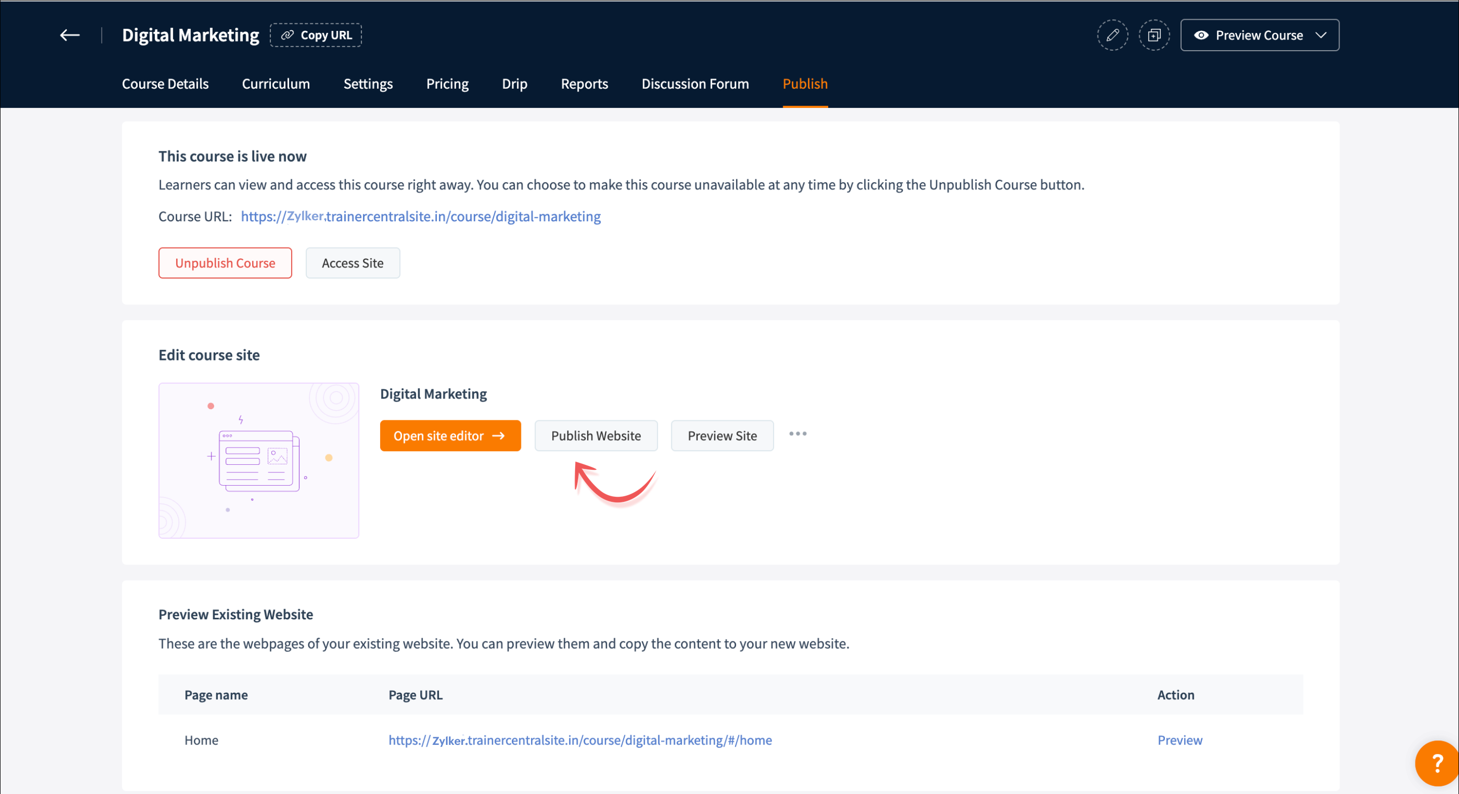 After creating the academy website, the next step is to publish it so that learners can access it.
