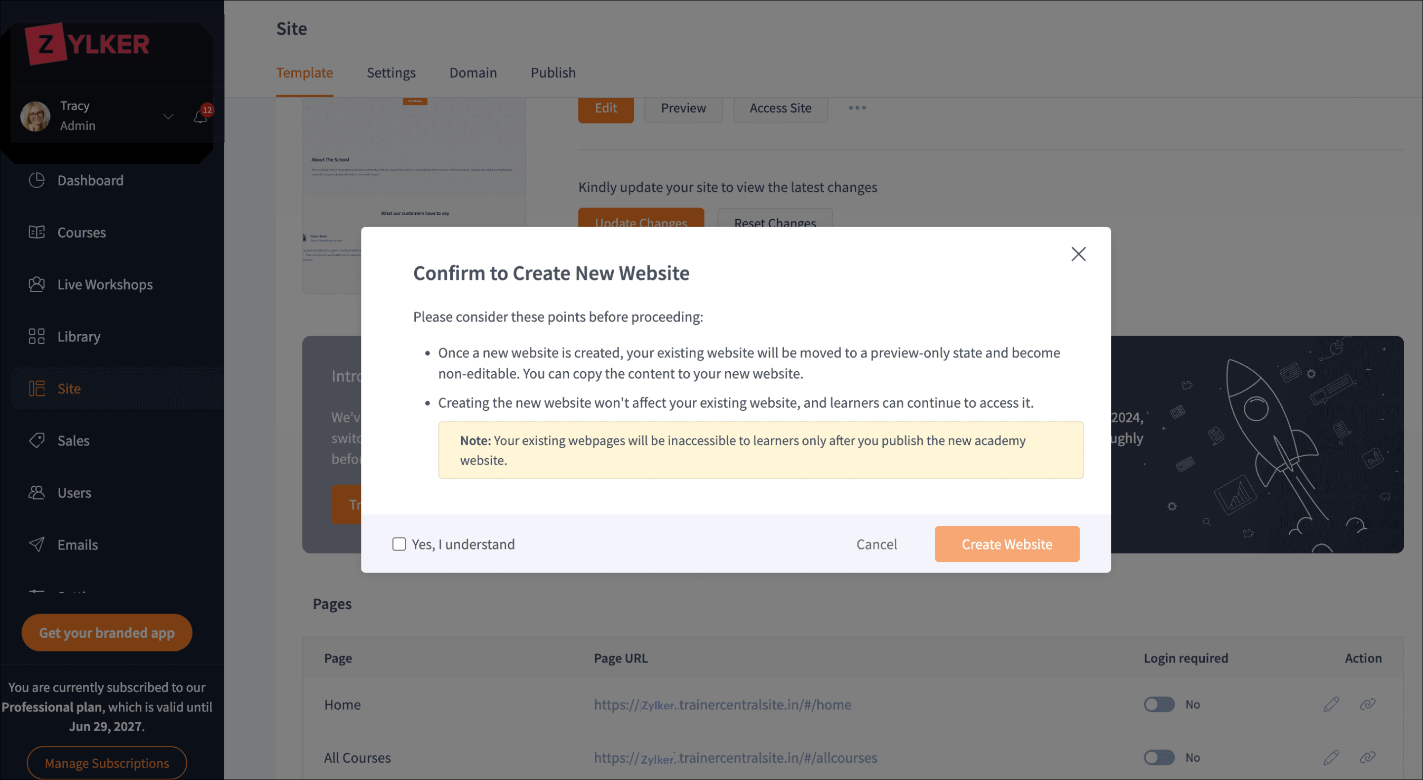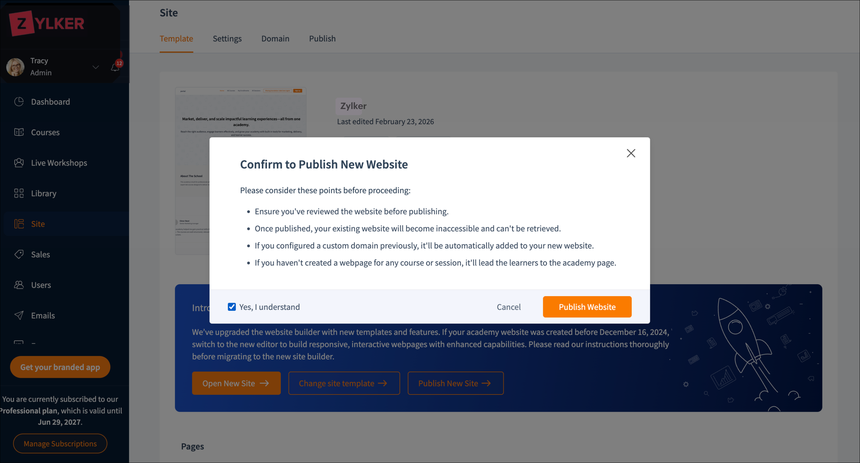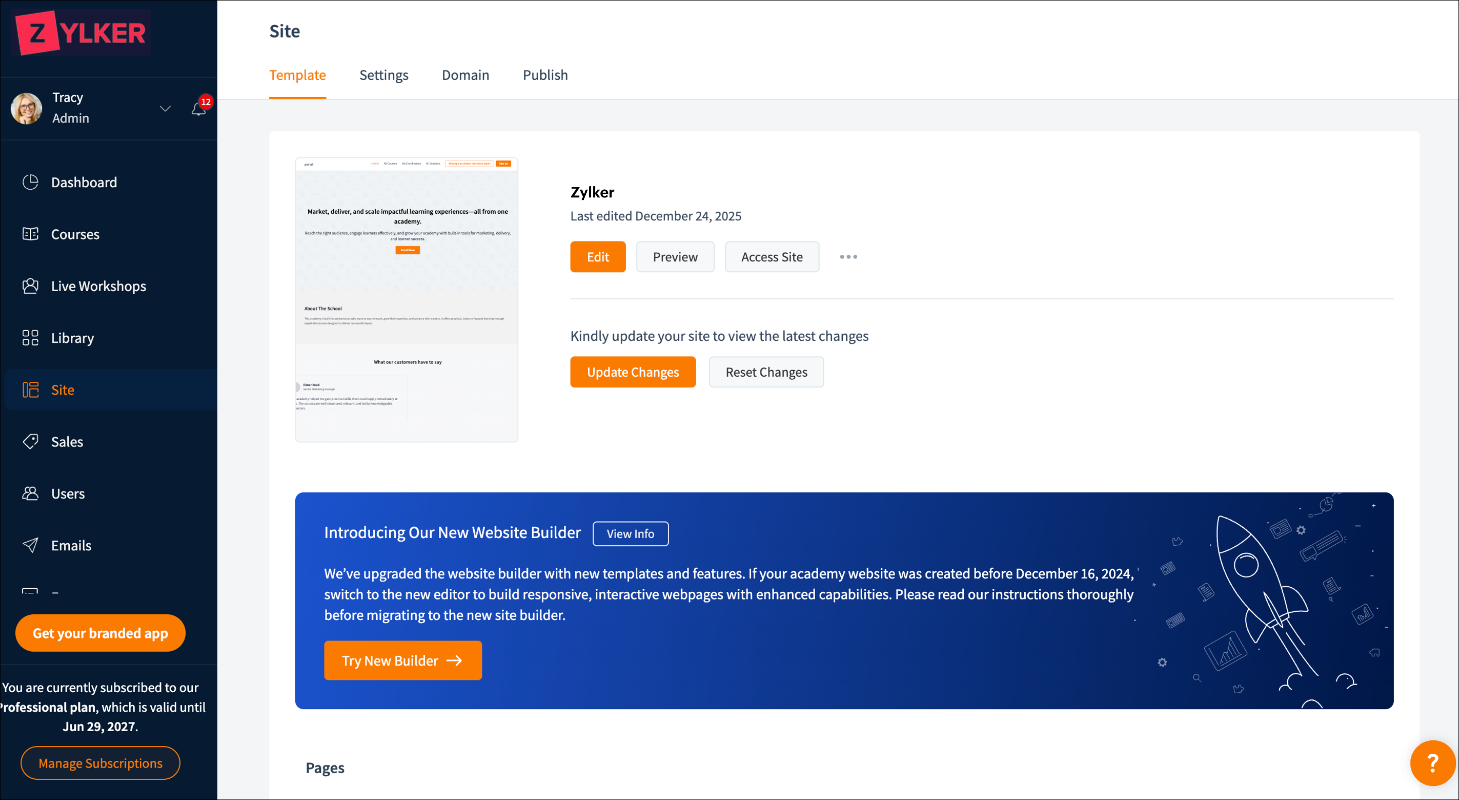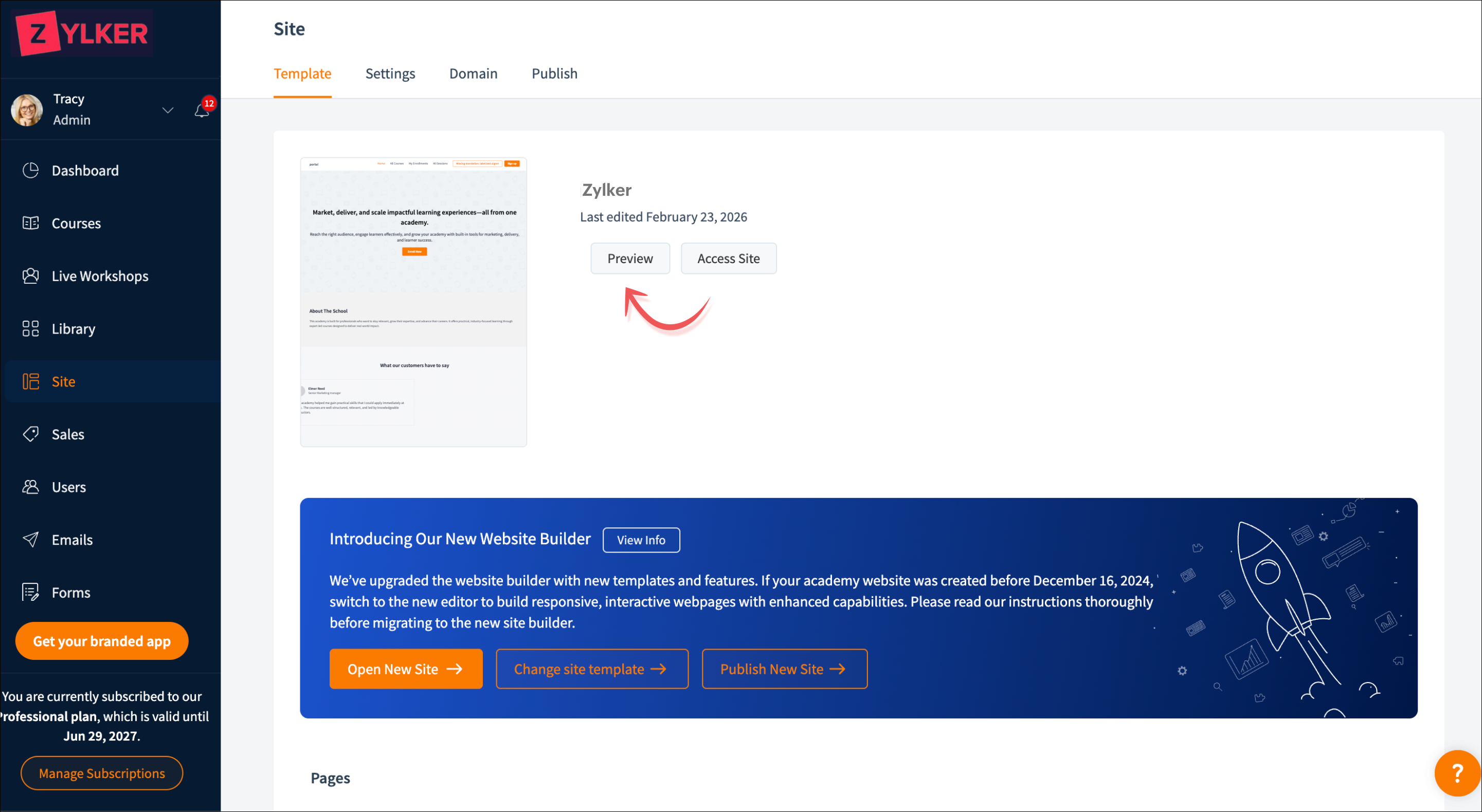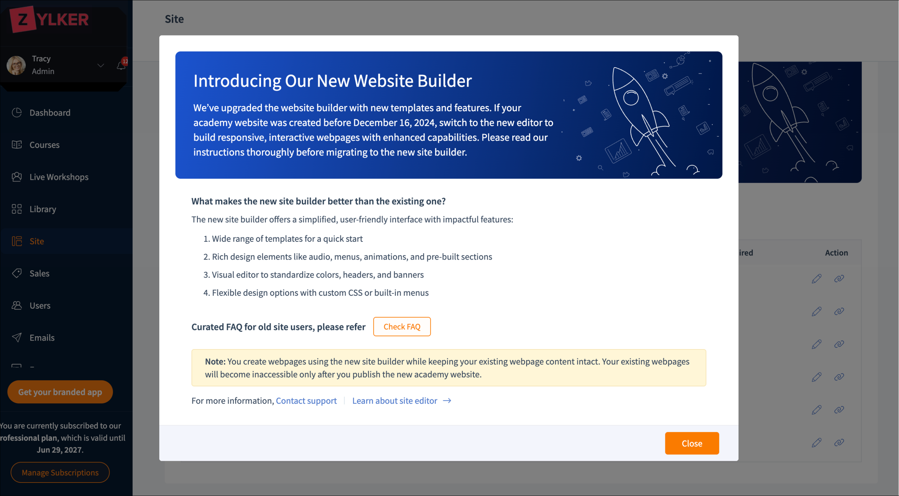 The new website builder offers a drag-and-drop interface, powerful tools, and customizable templates to help you build a stunning, scalable academy website. Now, you can either create the website from scratch or migrate content from the existing website to the new one.