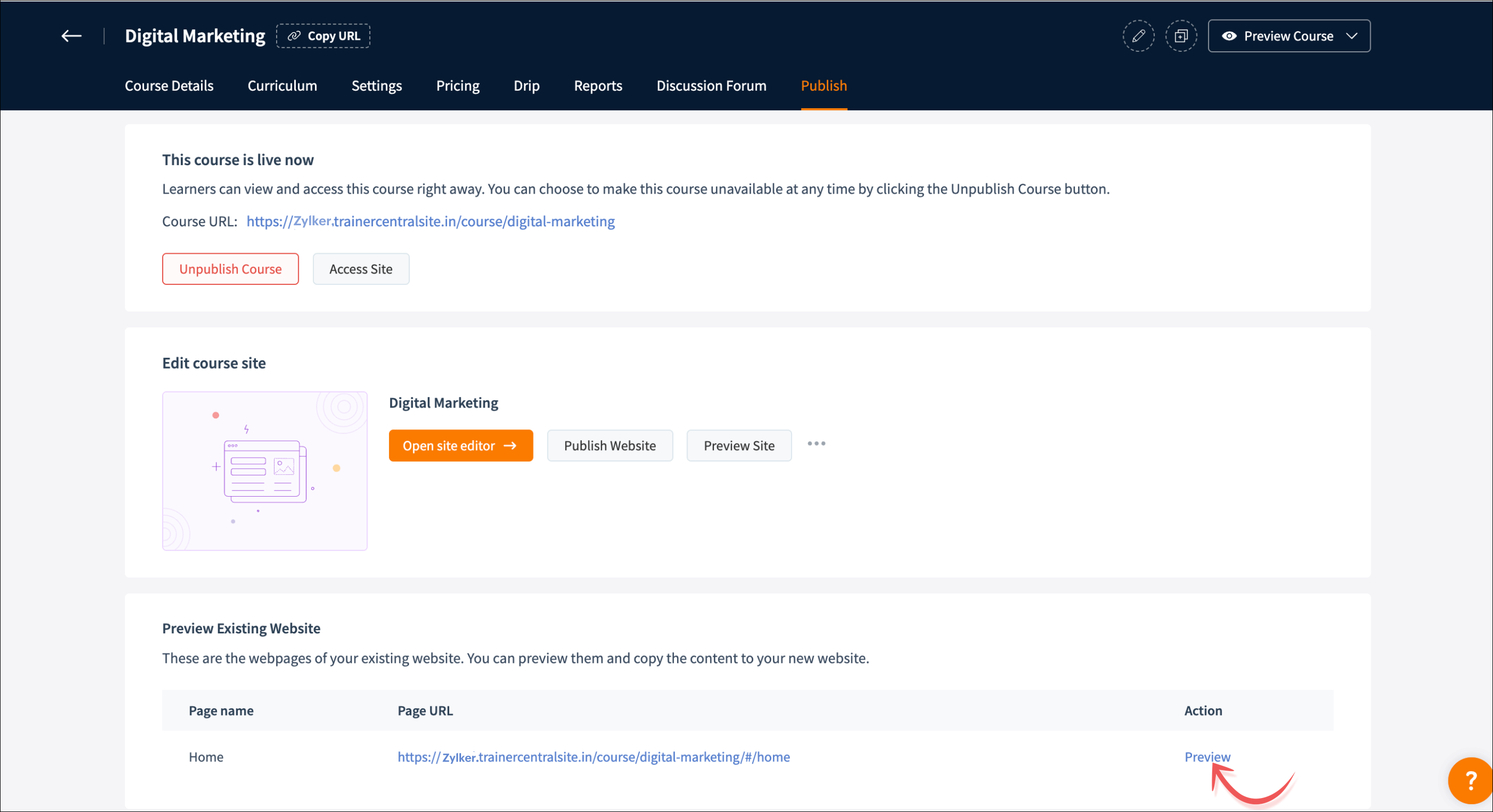 - In the Preview Existing Website section, click Preview. The existing course webpage will be displayed in the same tab.