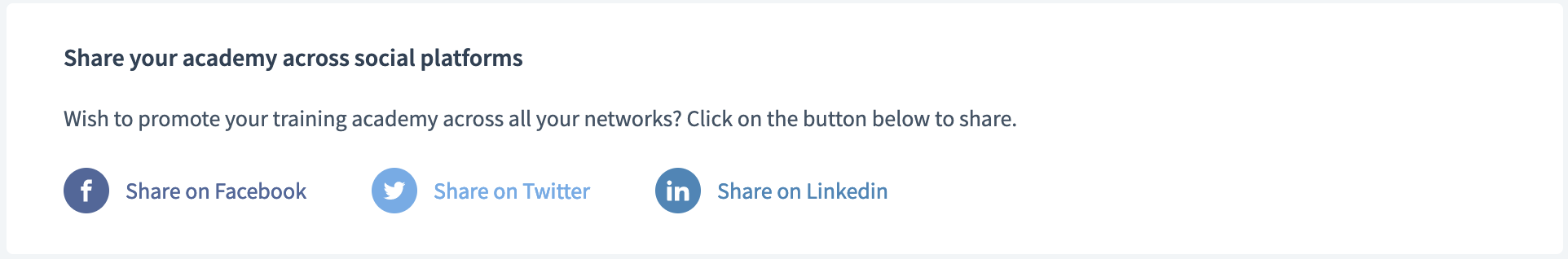 You can share your training academy across your all your social media platforms for better visibility and reach. Click on any of your preferred social platform, enter your credentials and share it with your networks.