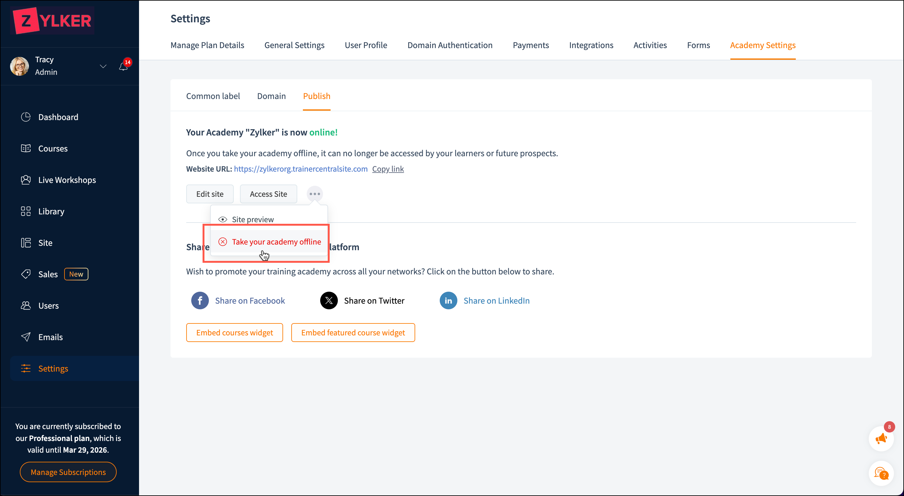 Once you take your academy offline, your enrolled learners will not be able to login to your academy, your published courses cannot be accessed and your prospects will be unable to visit the academy site, enrol for courses etc.