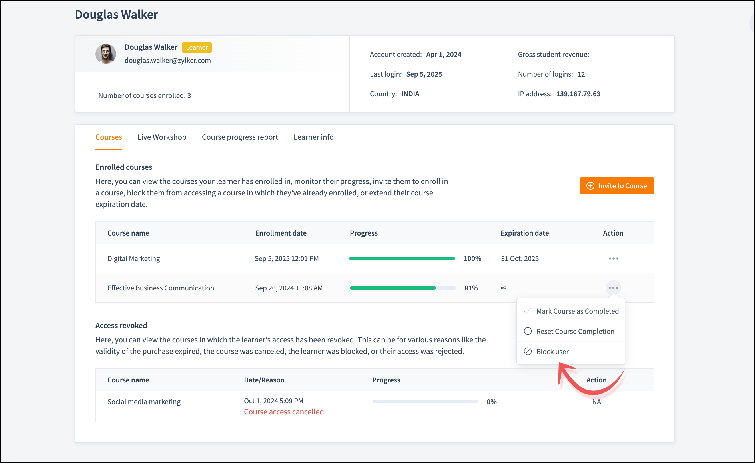 The Access Revoked section will display the courses in which the learner's access has been revoked. This can be due to various reasons, such as the purchase validity expiring, the course being cancelled, the learner being blocked, or their access being rejected. You can perform the following actions on the learner record: