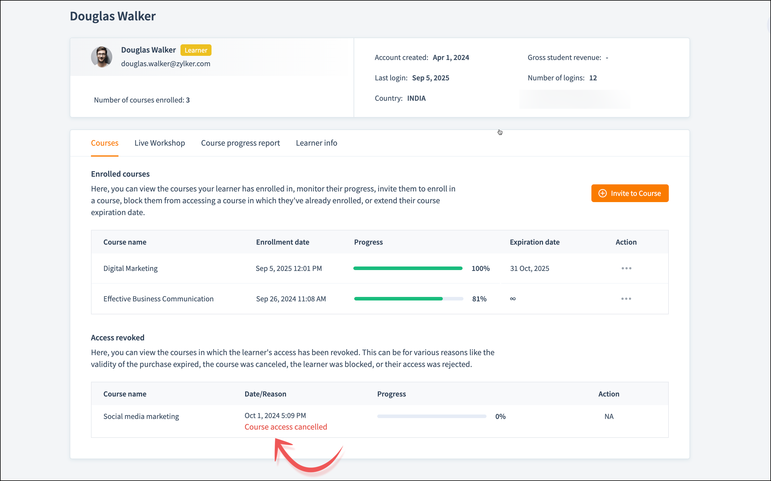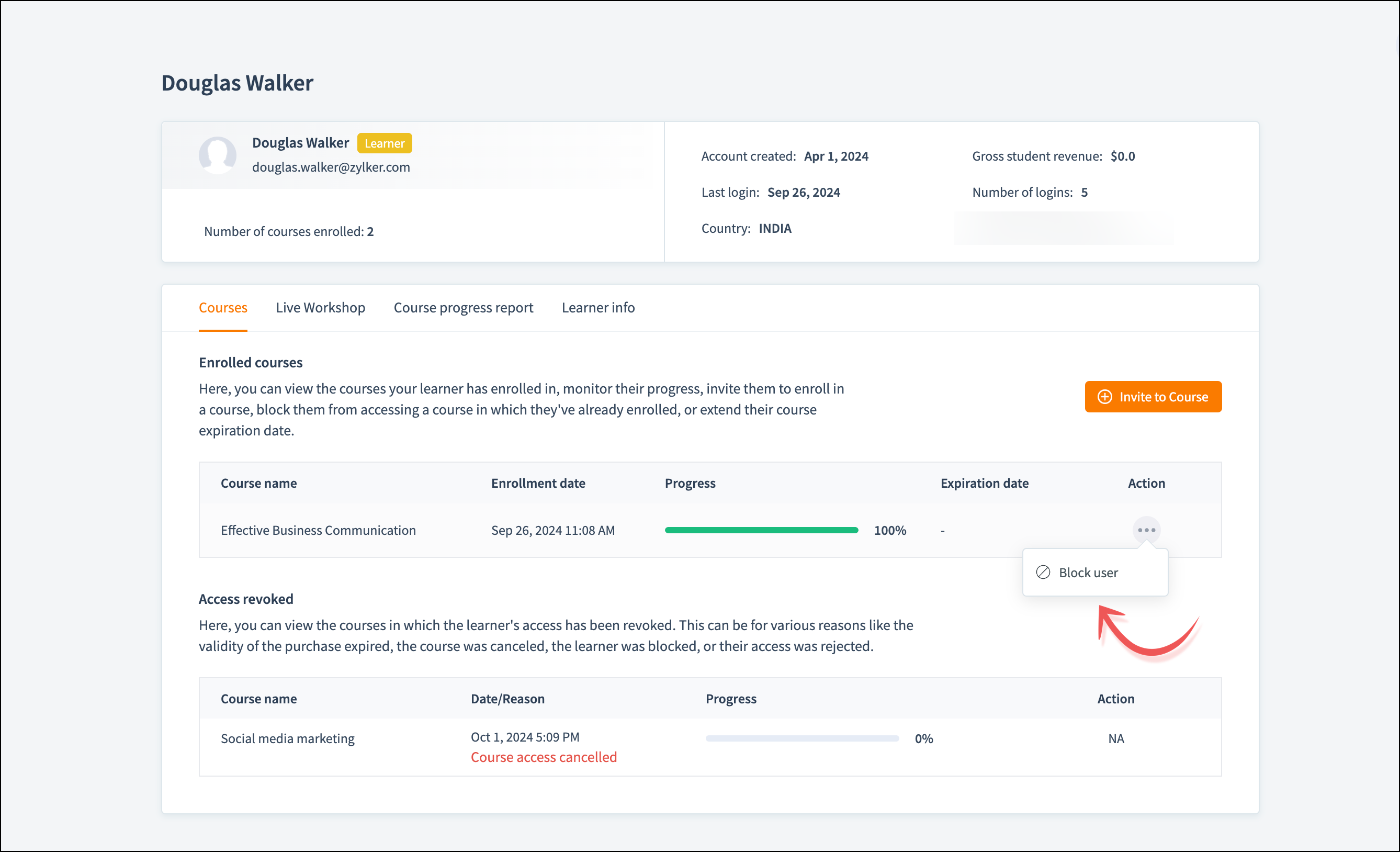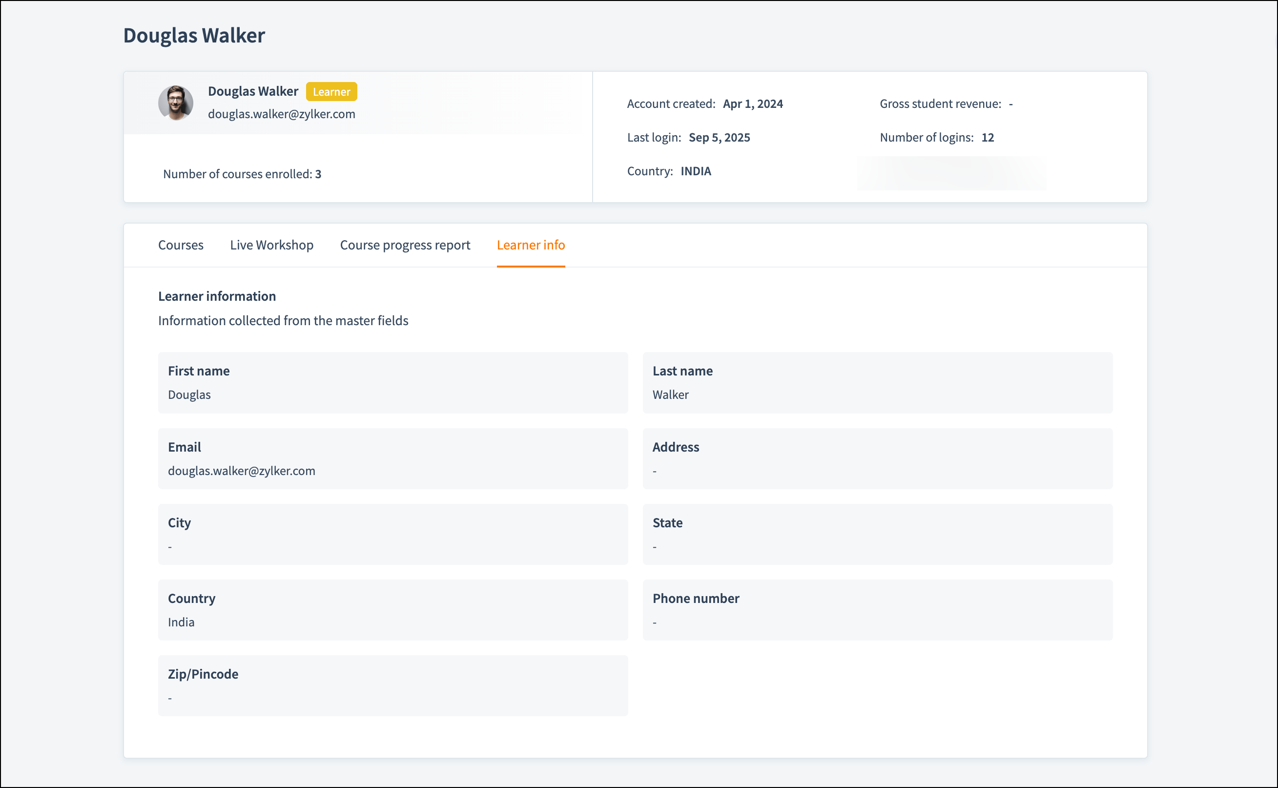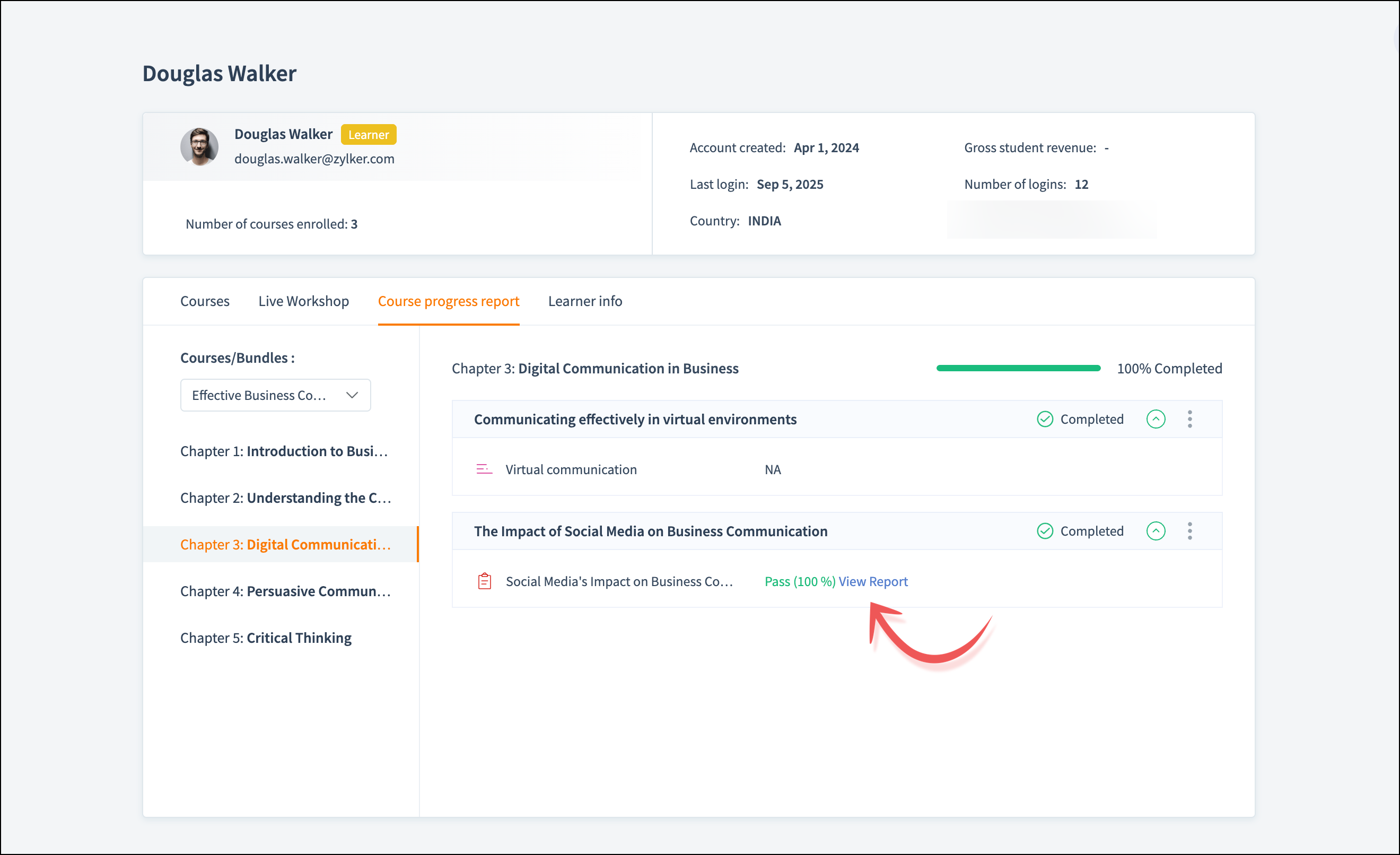 - Click on the email address of the learner for whom you want to view the progress report. The page will be displayed with Course, Live Workshop, Course progress report, and Learner info tabs.