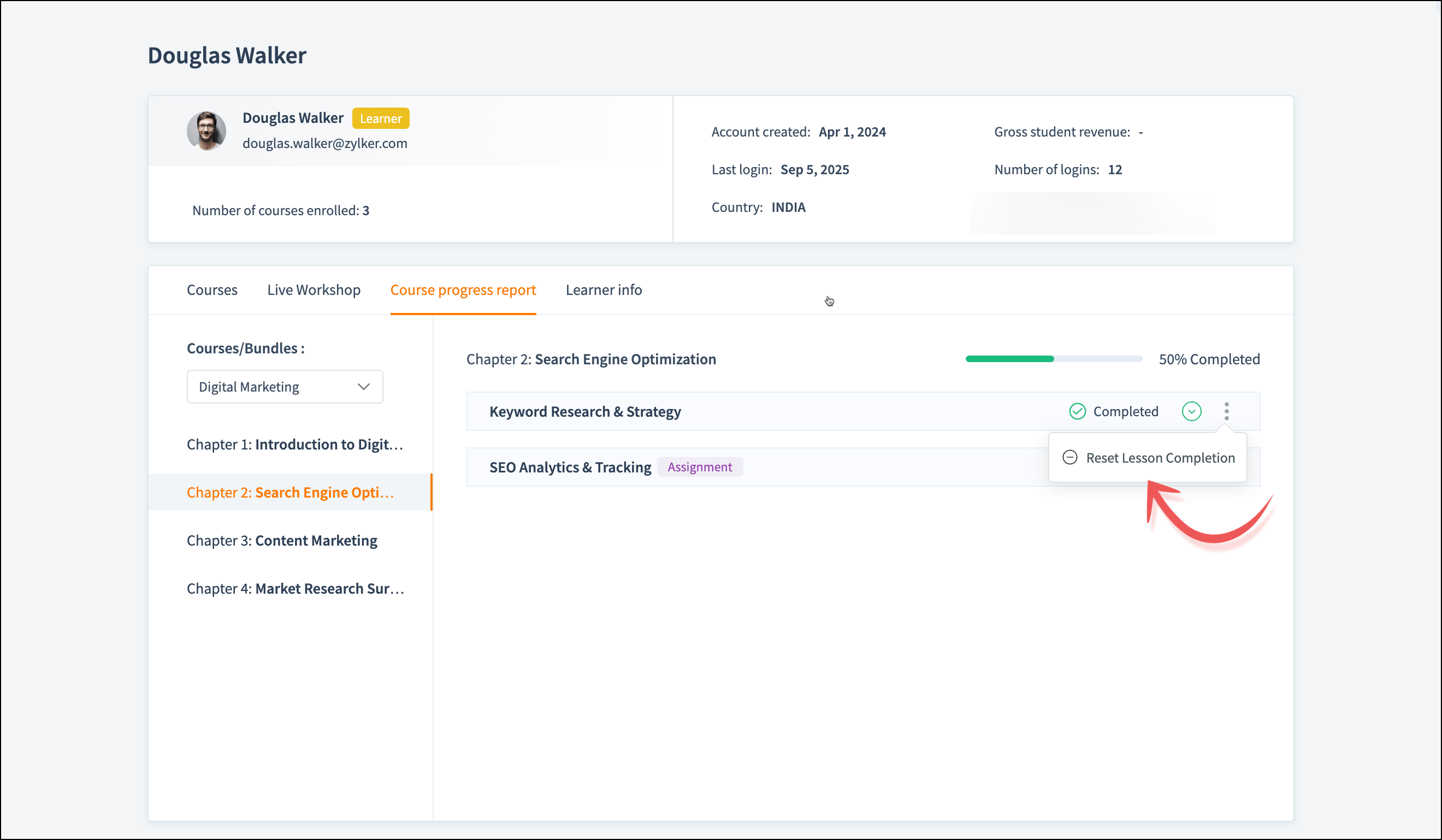 Reset Course Completion: You can reset a learner's course progress so they can retake the course.