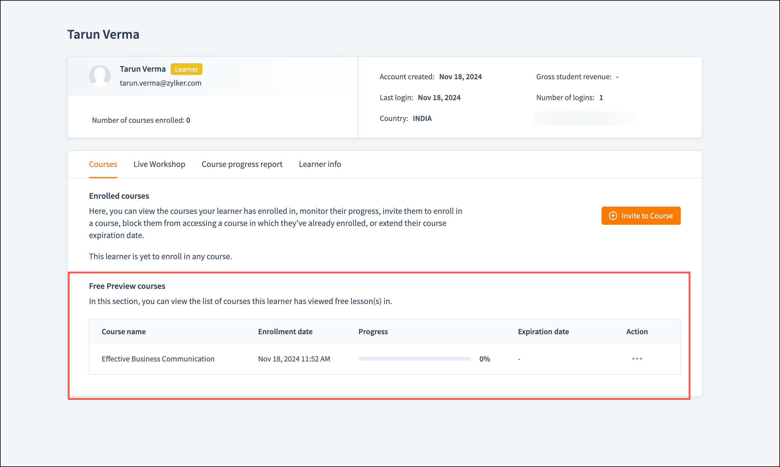 Click the Courses tab. The page is divided into four sections such as learner's enrolled courses, enrollment pending courses, previewed courses, and access revoked courses.