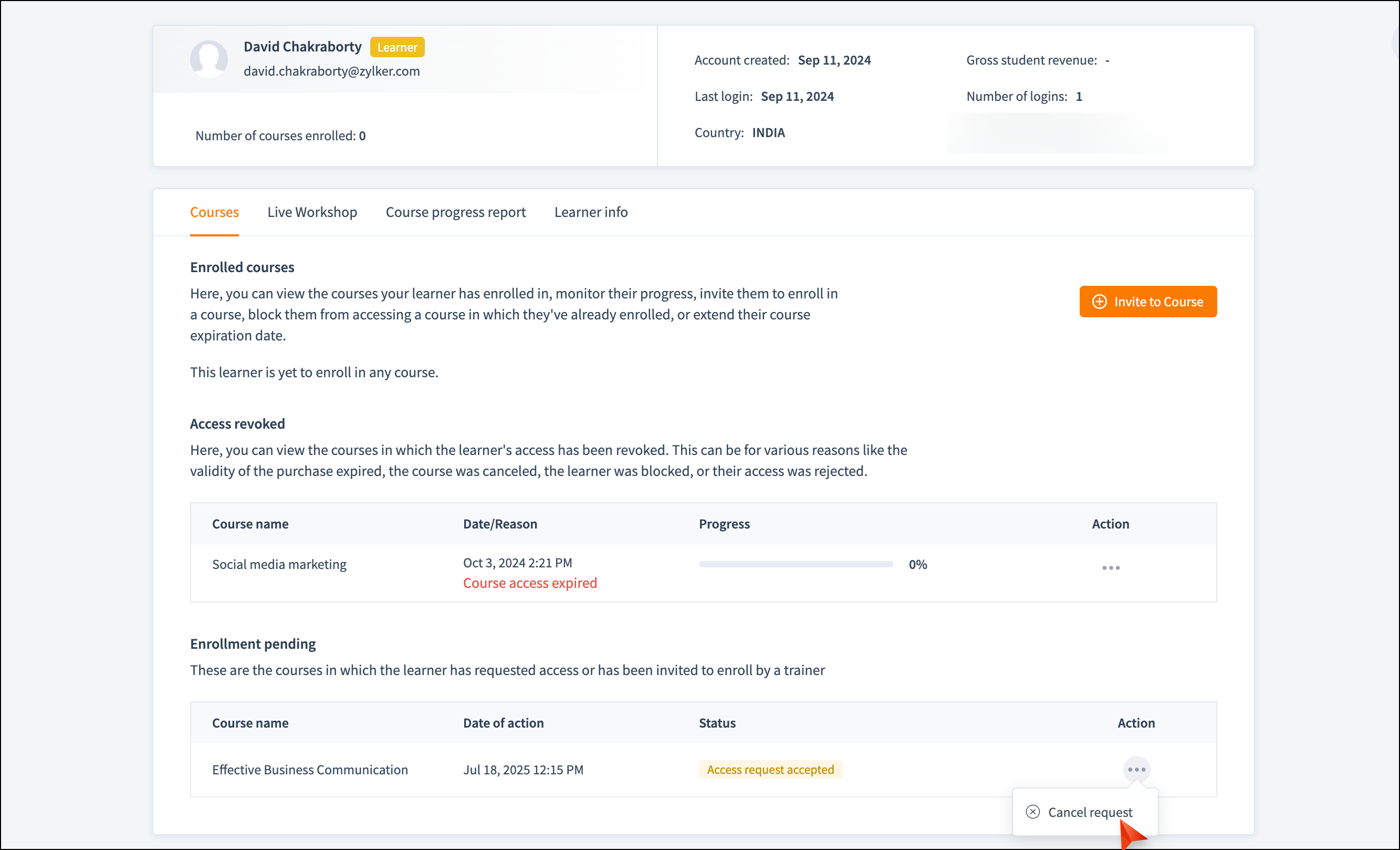 The Enrollment pending section will display the courses the learner has been invited to or has requested access to. You can perform these actions on the learner record