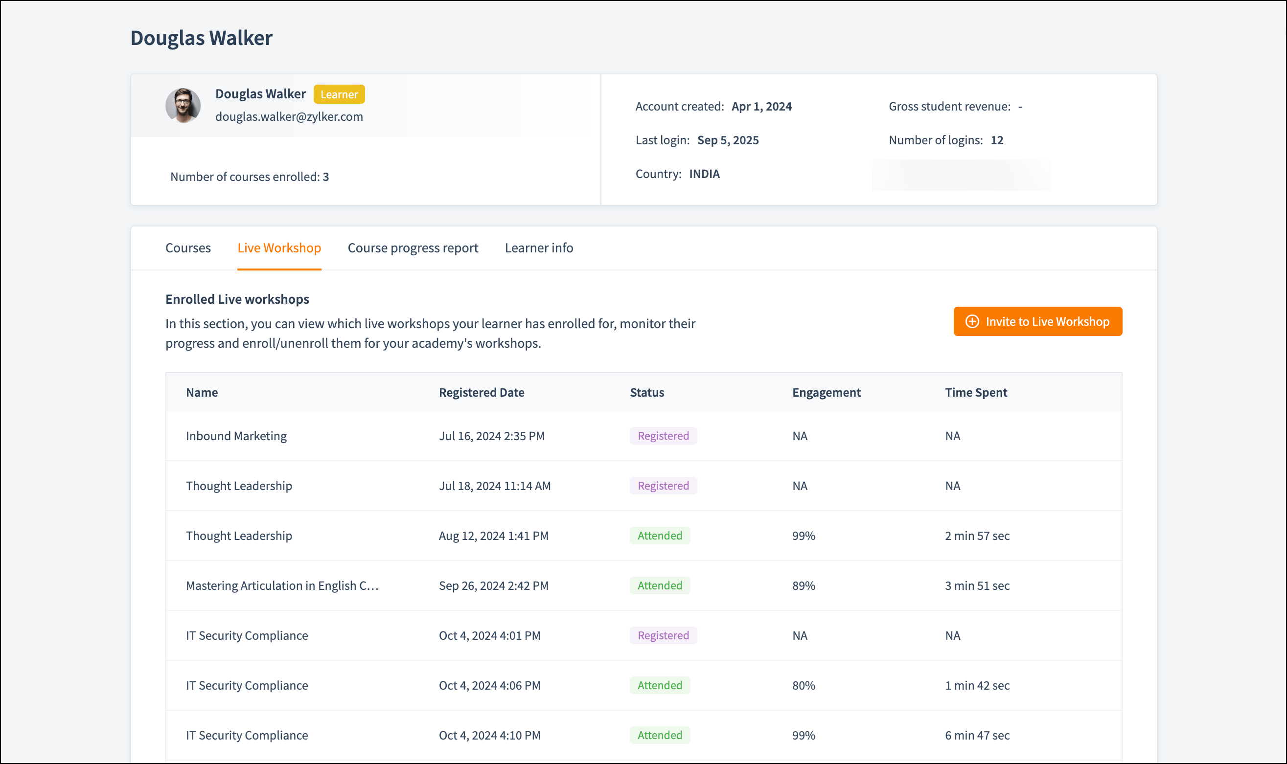 Click the Live Workshop tab. The learner's enrolled sessions, engagement, and time spent on them will be displayed here.