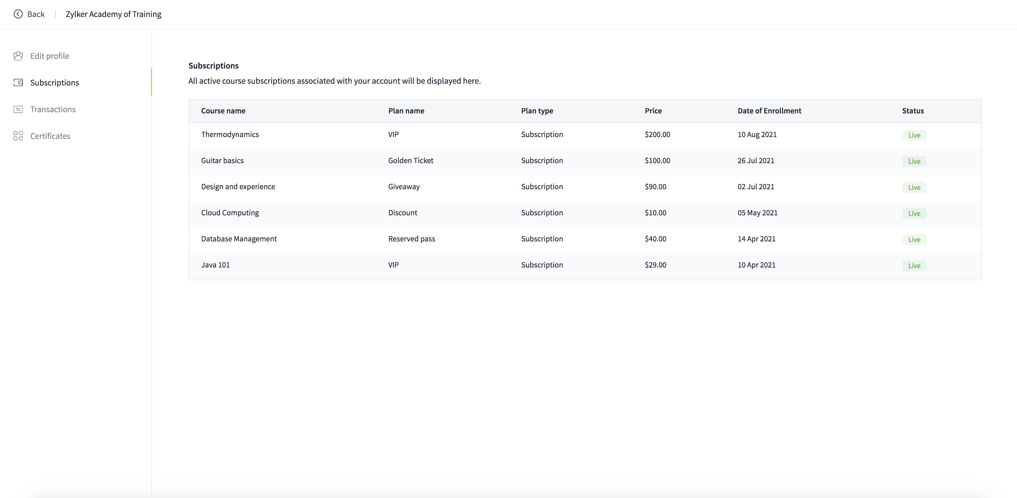 As a learner, you can view and track all your active course subscriptions associated with your account in TrainerCentral. You can see the list of courses you've subscribed to, amount paid, date of enrollment etc.
