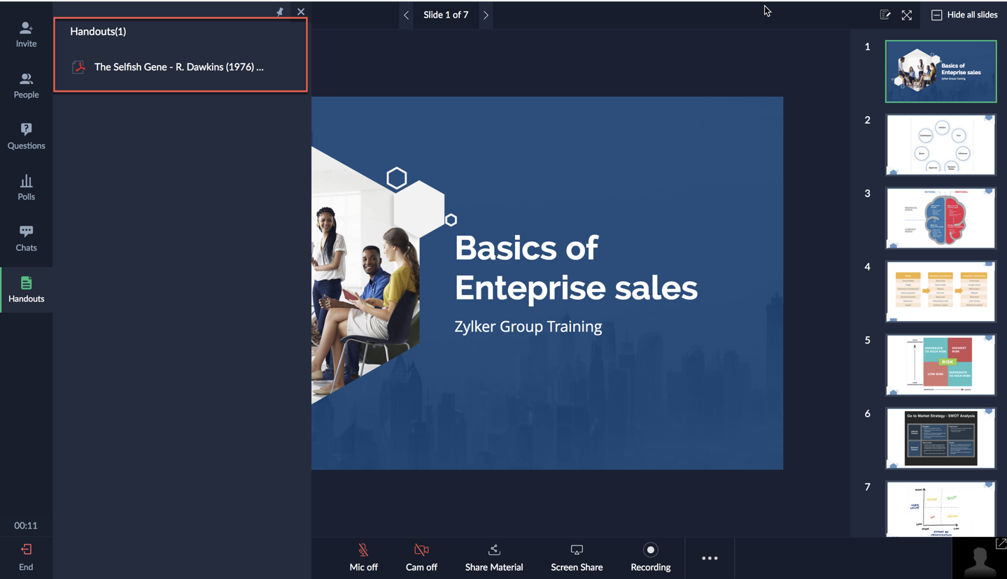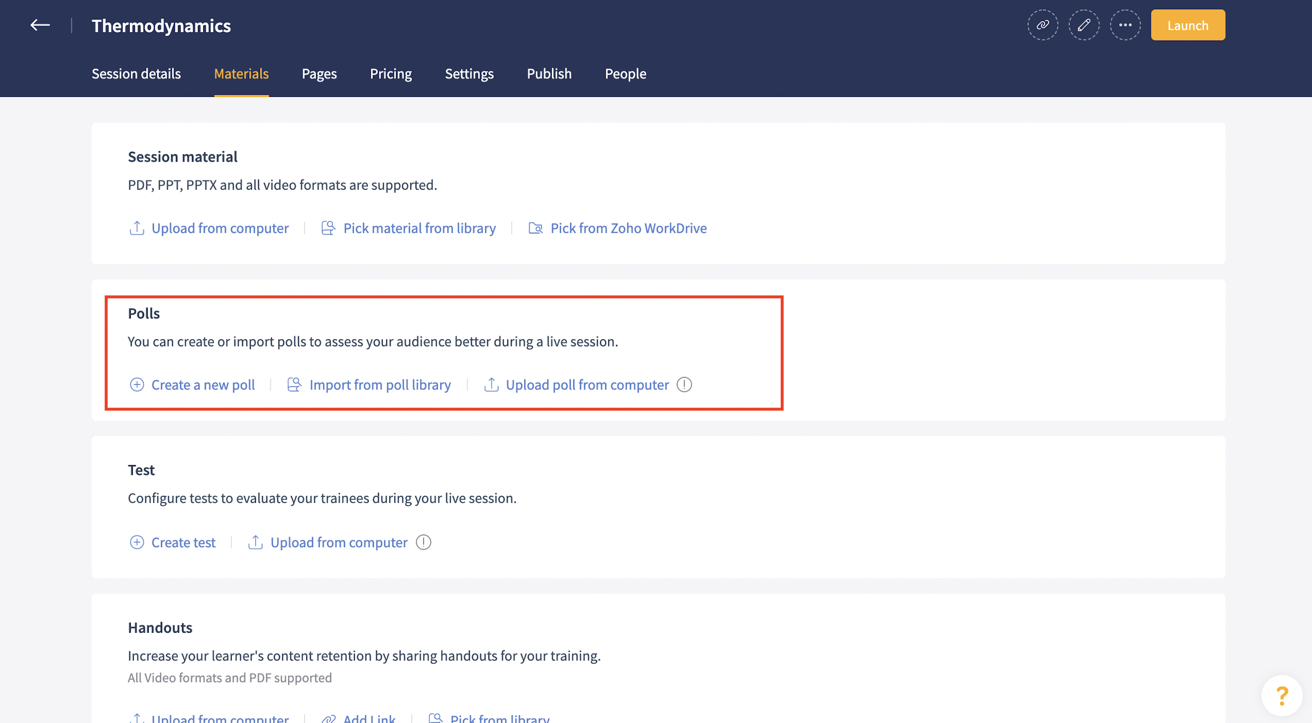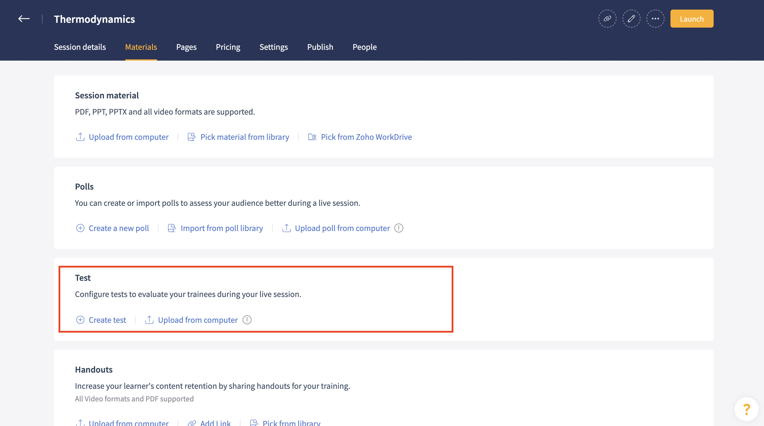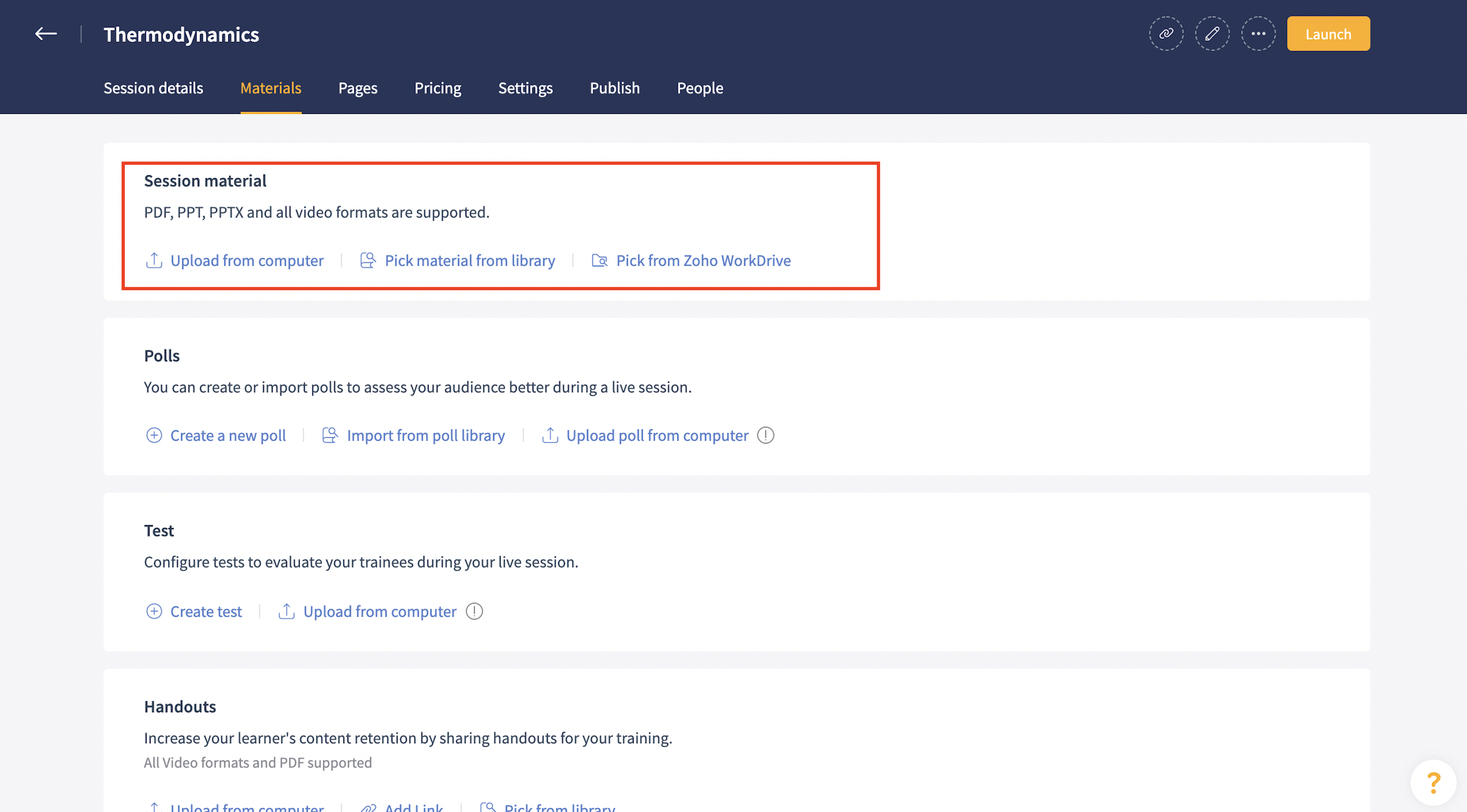 TrainerCentral allows you to add multiple materials for your live trainings and you can have any number of pdf or videos added to a single training session. You can upload a presentation, pdf and video files from your computer, pick files from your Zoho Workdrive account or import one from your Presentation library.