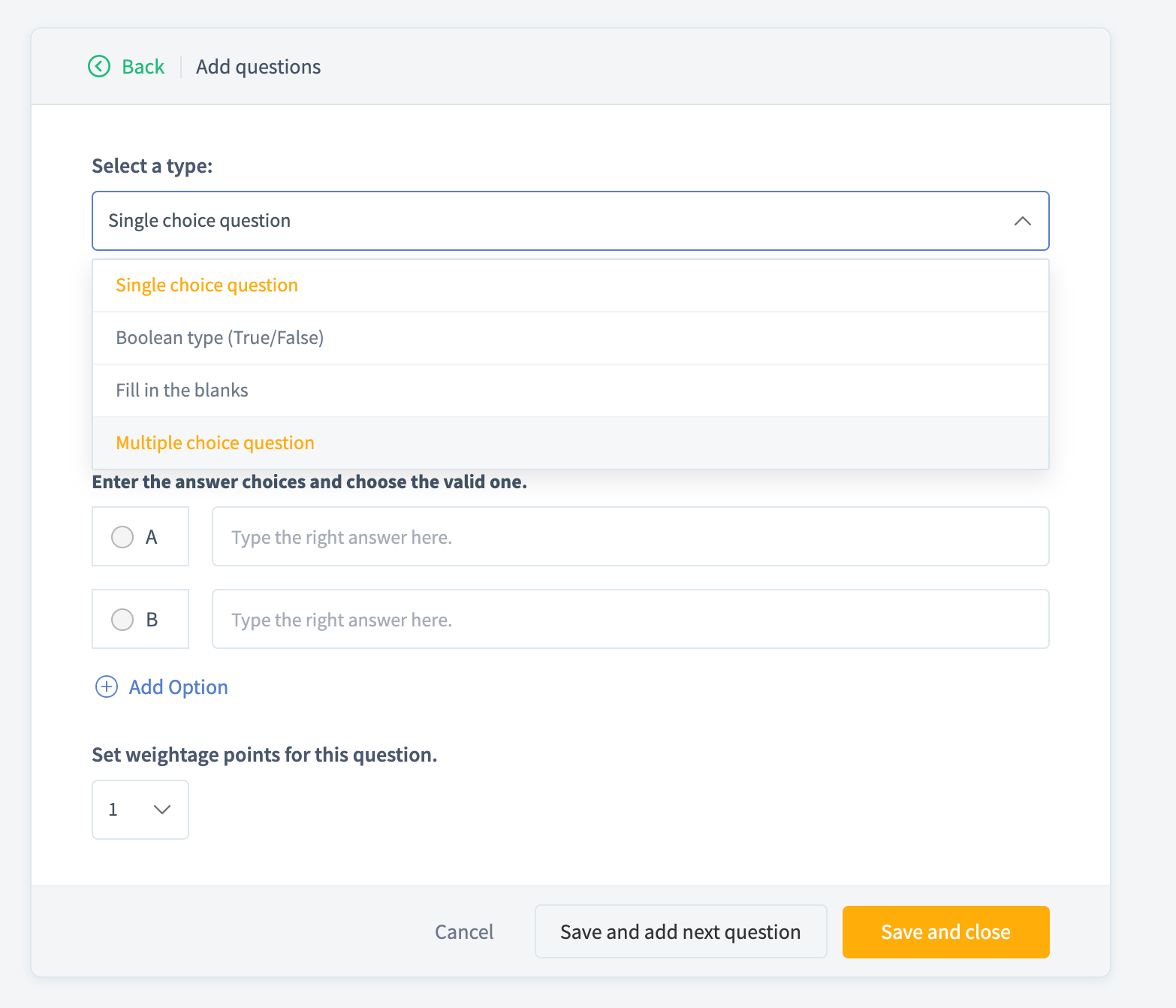 Choose the type of question that you wish to add and kindly ensure that you choose the right answer and the appropriate weightage for the question so that we can grade the results correctly.