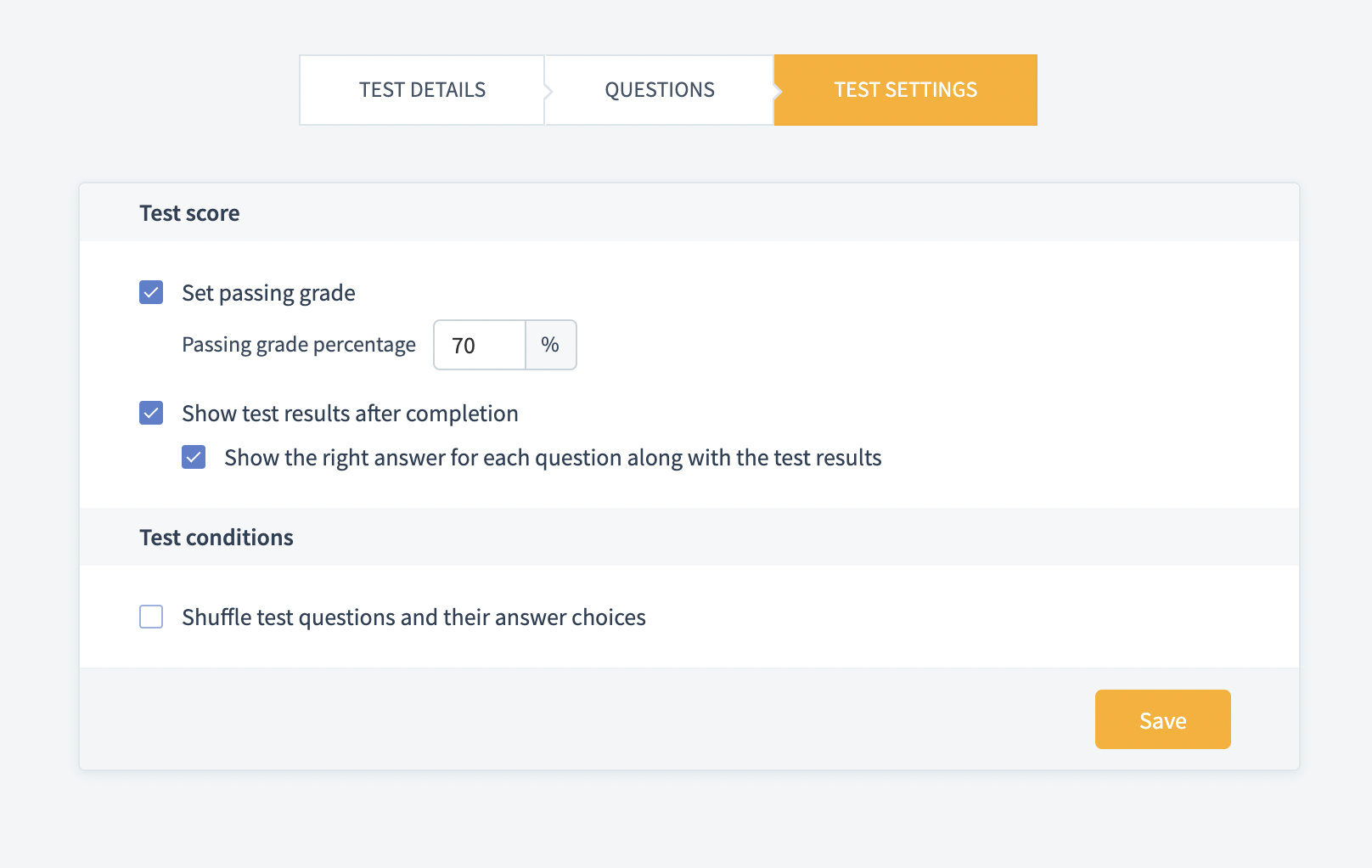 TrainerCentral offers various settings that you can configure for your test giving you complete control over how your learners are evaluated and graded. There are various settings like