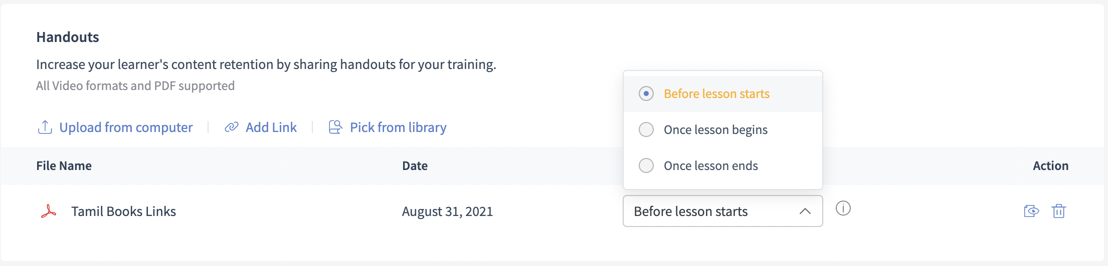Increase content retention by sharing handouts for your training. You can upload videos and documents from your computer, choose from TraineCentral's library, or add a file link.