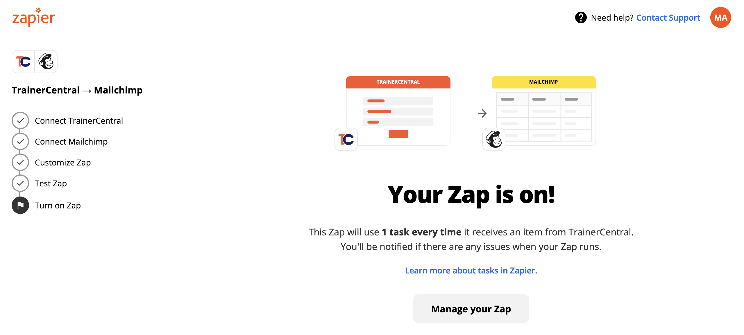 Zapier is an automation platform that easily moves information across your web applications. You can connect TrainerCentral to many other apps and services, including SuveyMonkey, MailChimp, Linkedin, Leadgen, and more. It enables you to automate your entire workflow by copying and moving your data between TrainerCentral and other online applications.