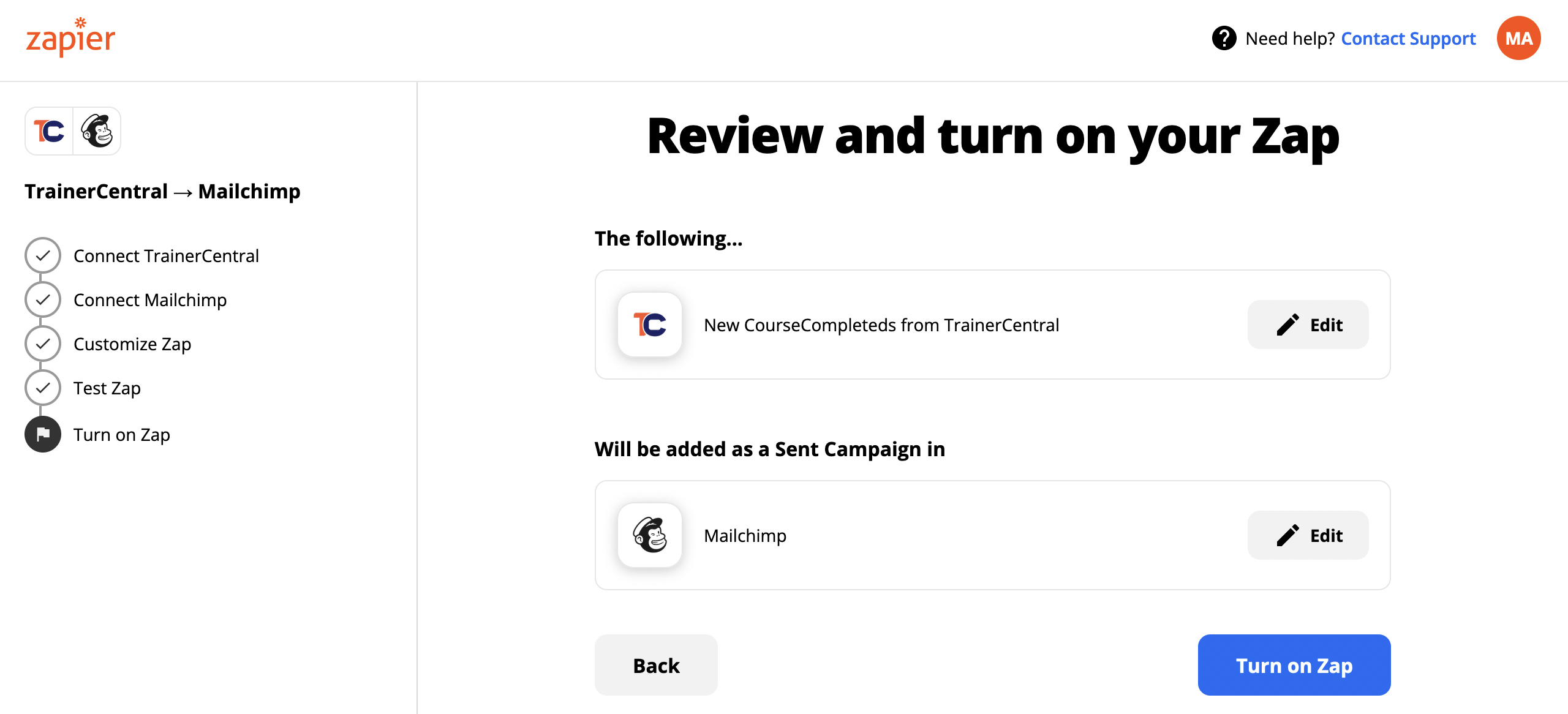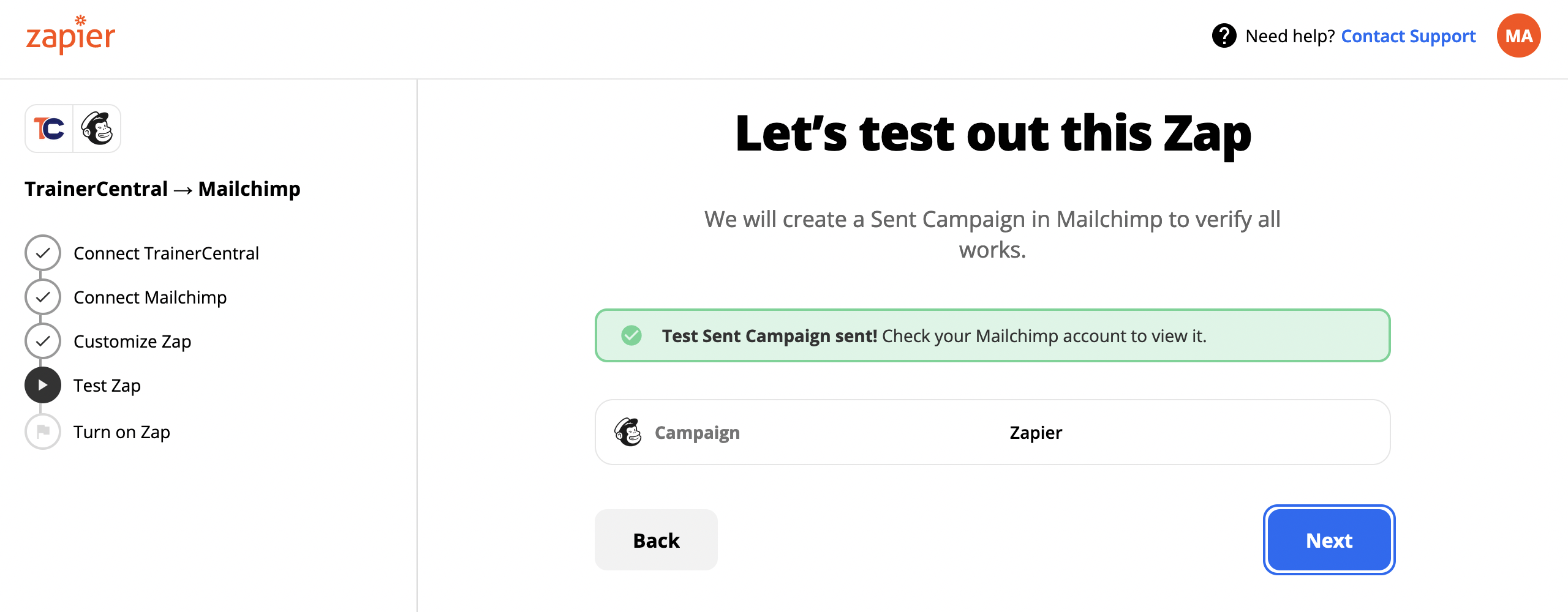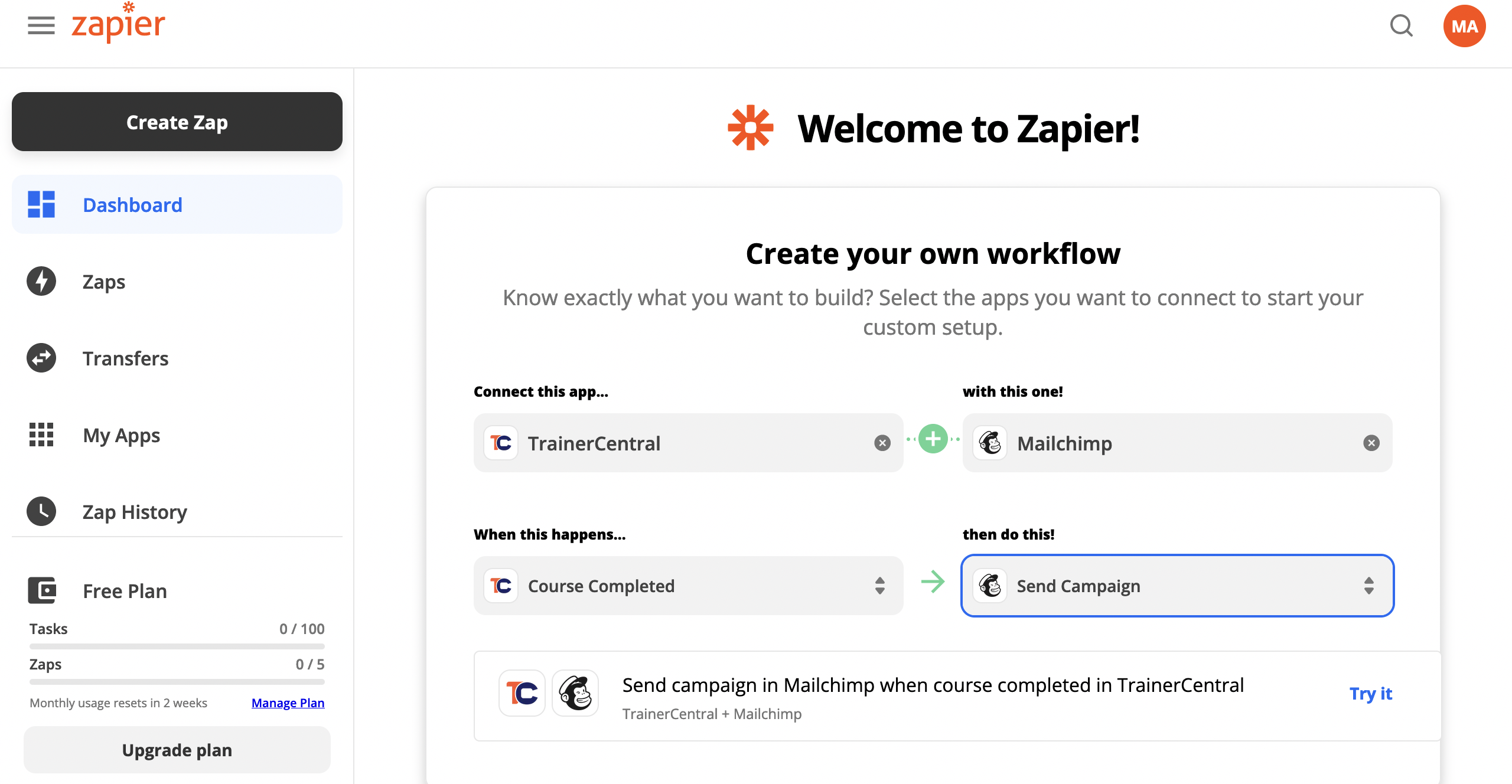 As an example, let's say you want a campaign to be sent in Mailchimp whenever a course is completed in TrainerCentral. Here's how you would go about it:
