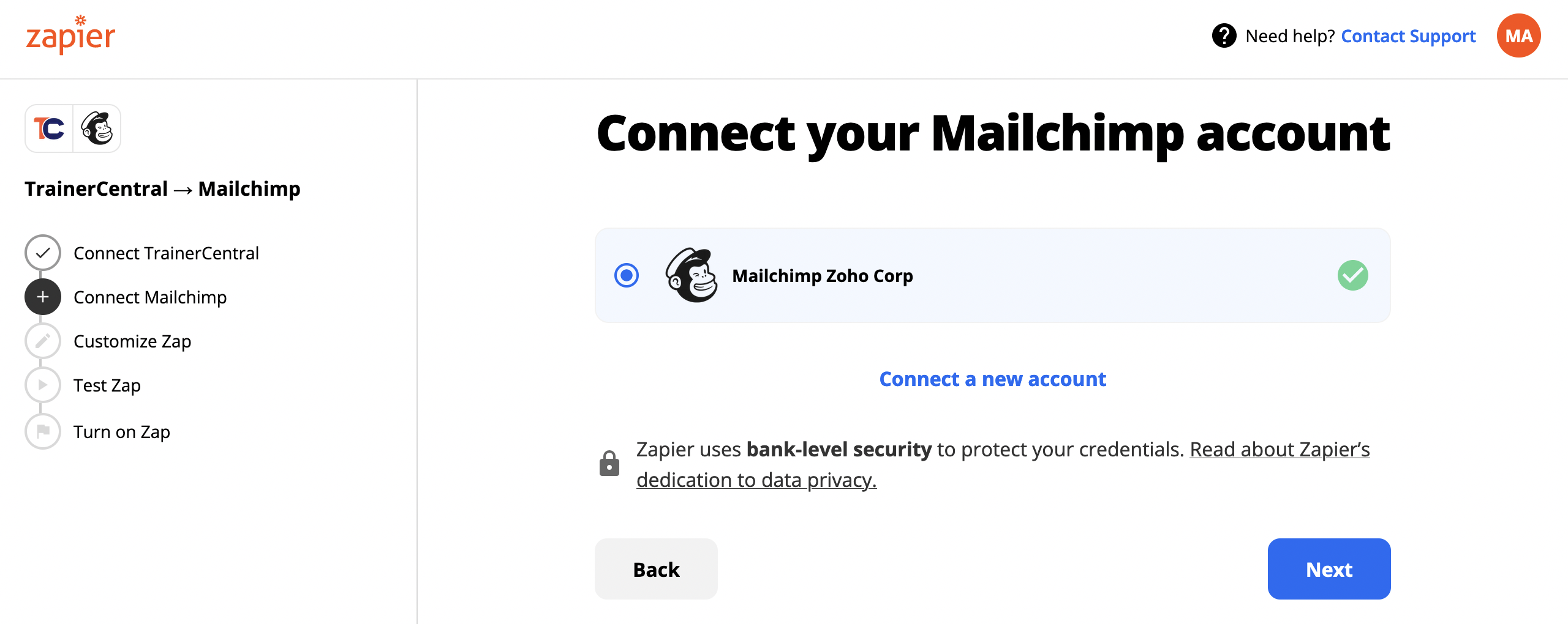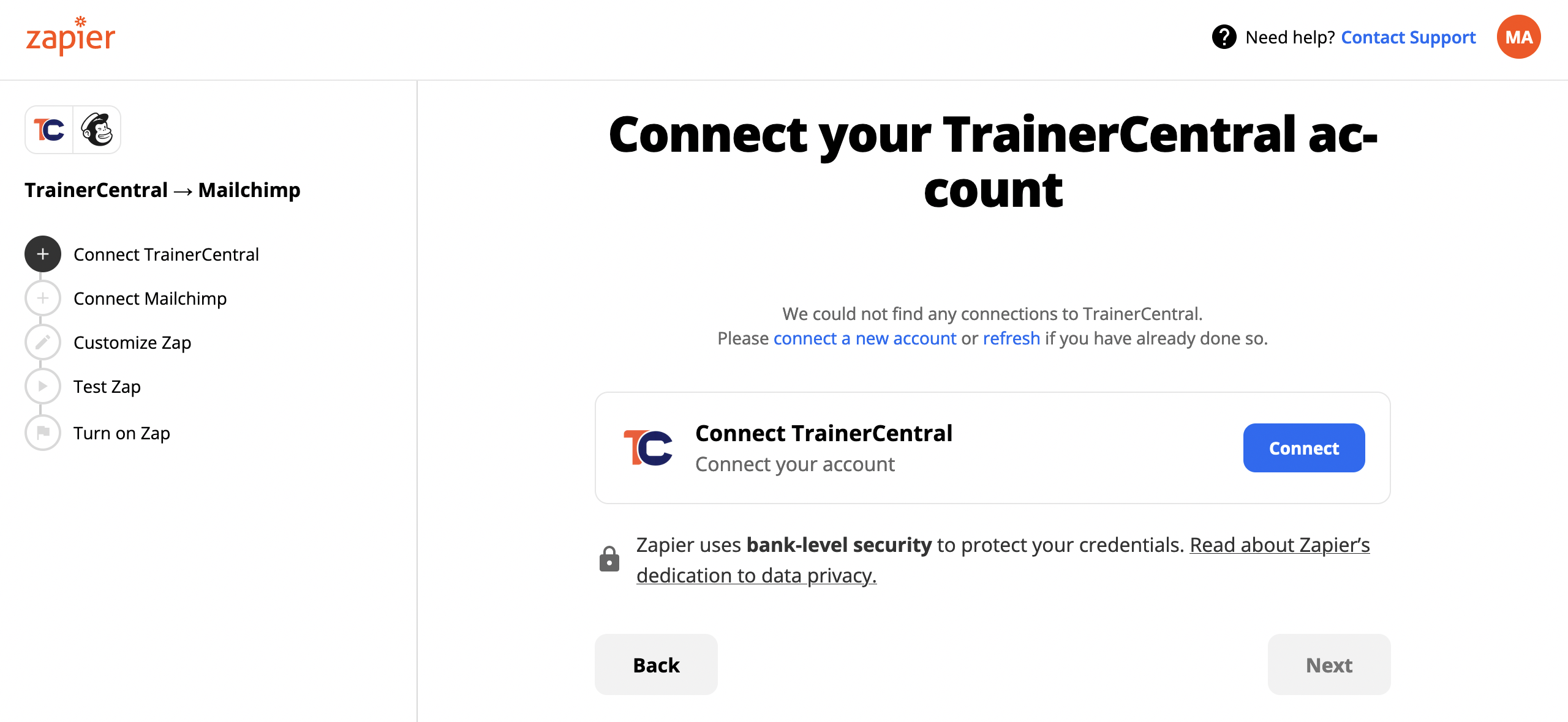 4. Add your TrainerCentral account to Zapier to connect with its services. Click Connect an Account. The next time you create a Zap using TrainerCentral, you can use the same account again without needing to reconnect.